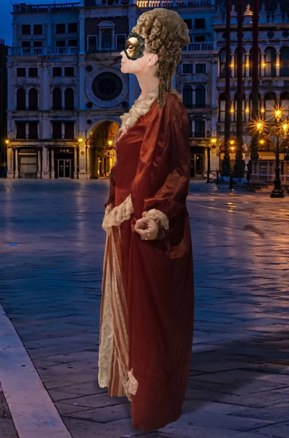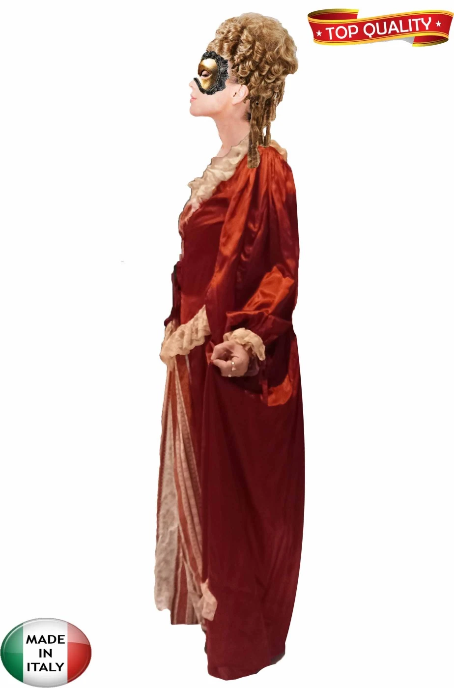 Se invece vuoi entrare in una macchina del tempo e vuoi trovarti davvero nell’epoca dei broccati e delle sete, degli abiti delle nobildonne e dei loro cavalieri, ti proponiamo questo stupendo vestito da dama in stile veneziano di un elegante color borgogna realizzato a mano da una delle ultime sartorie italiane che produce abiti del carnevale di Venezia.
