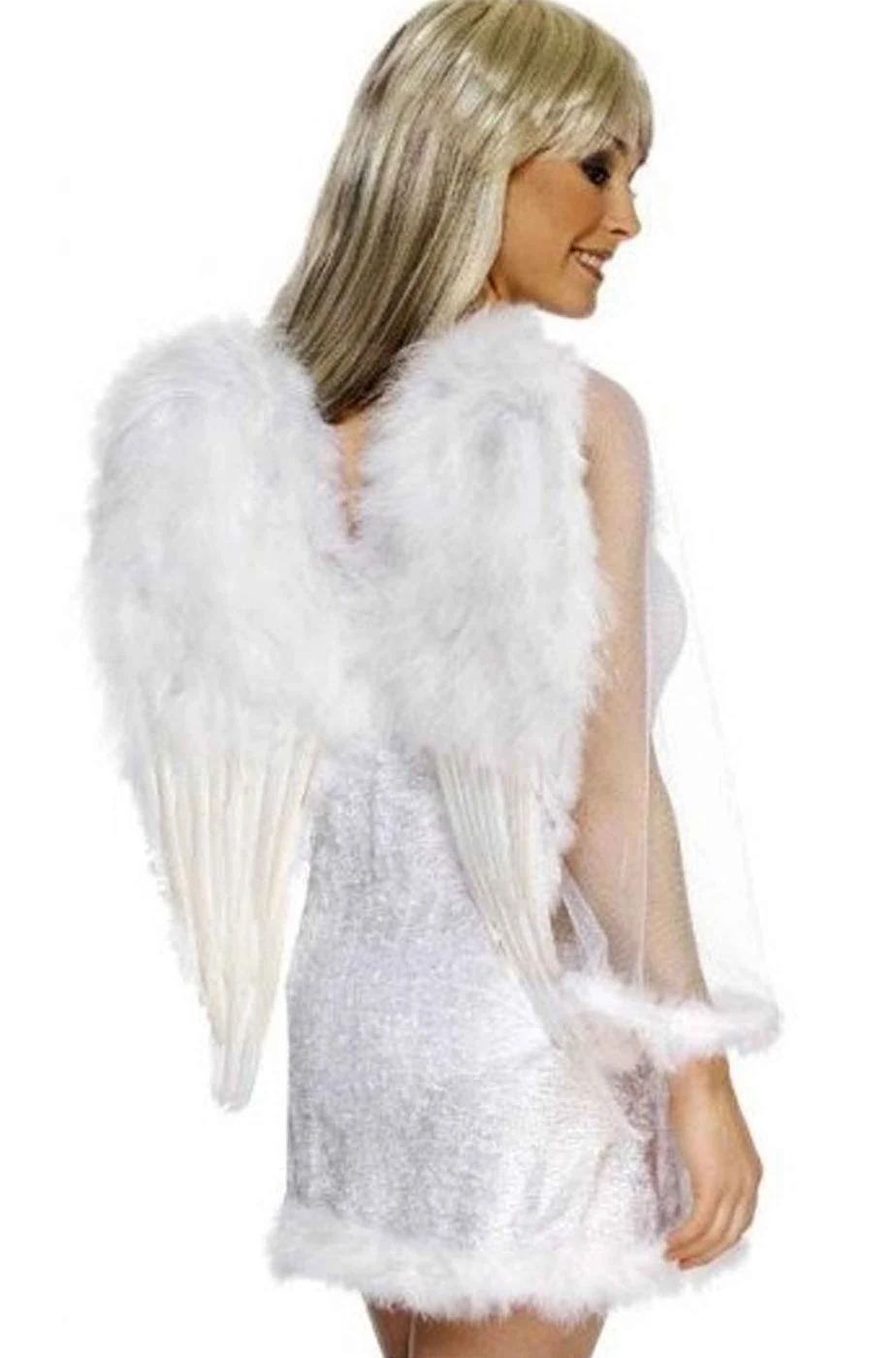 Si indossano con le apposite bretelline in dotazione queste grndi ali bianche da angelo con struttura di leggero polistirene e mille piume bianche e marabou applicati sopra.
