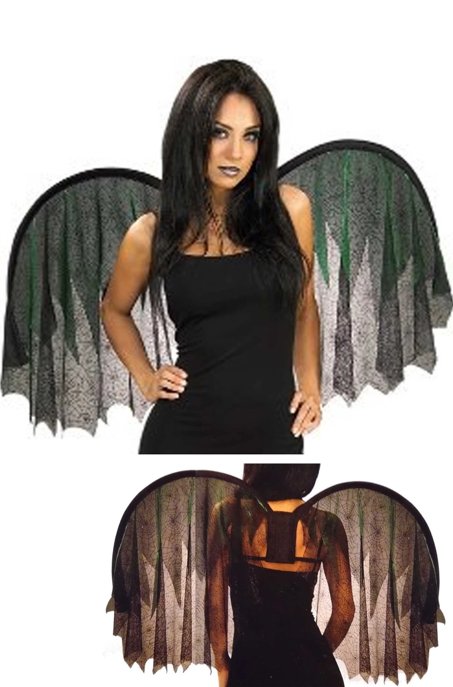 Grandi ali nere da strega dei ragni composte da un’armatura imbottita larga ben 91cm a tutta apertura e dall’ala in finta ragnatela in tulle sintetico. Si indossano con le apposite bretelline. Perfette ali finte da strega, da vampira, da dama gotica. Vengono fornite arrotolate nella busta. Vanno poi srotolate ed aperte e lasciate in forma prima di indossarle.