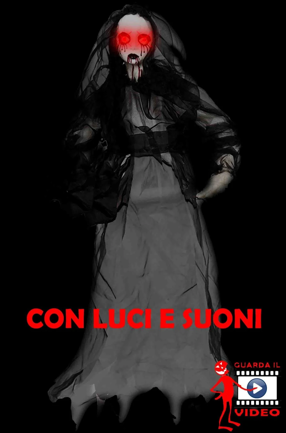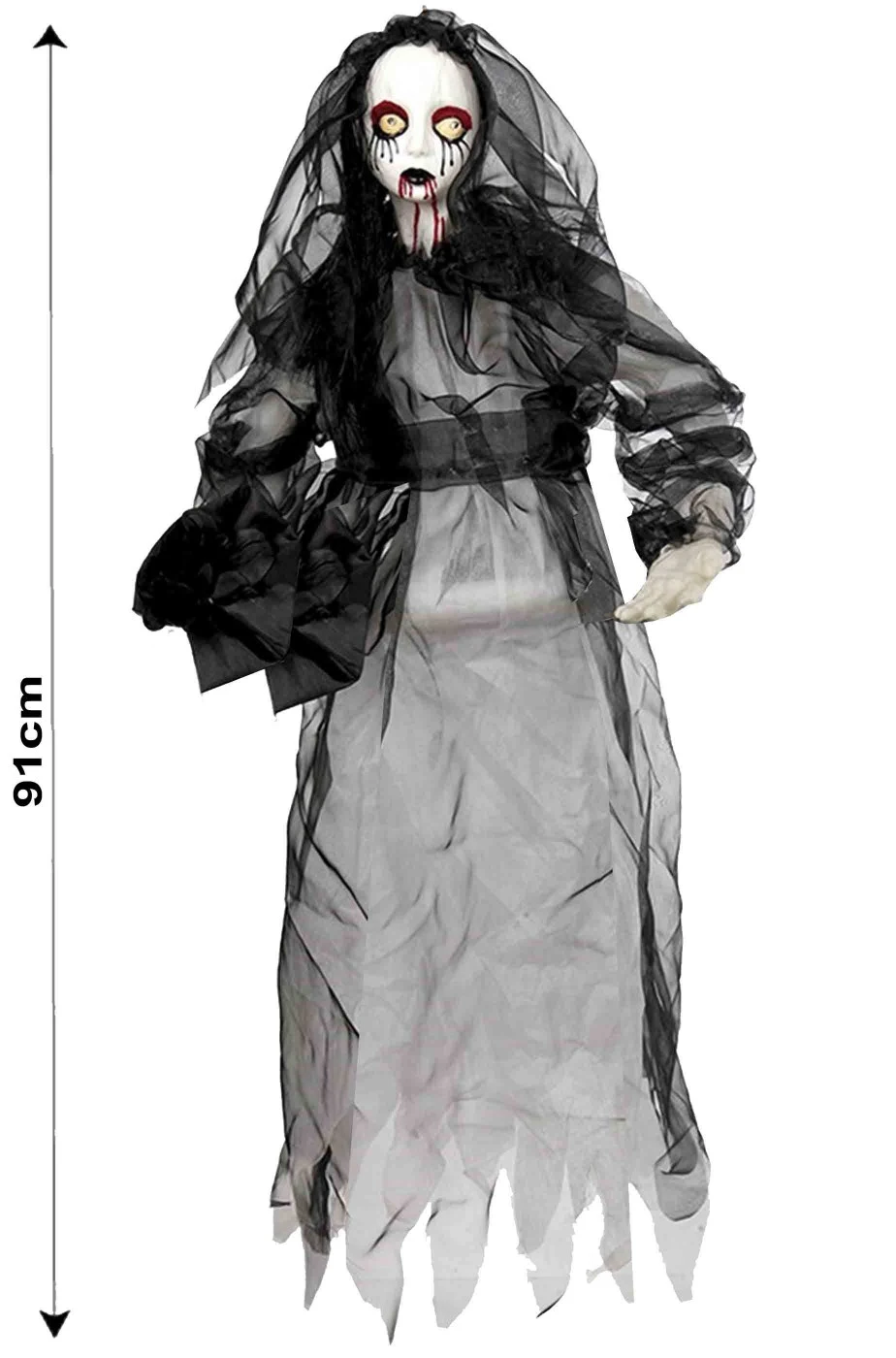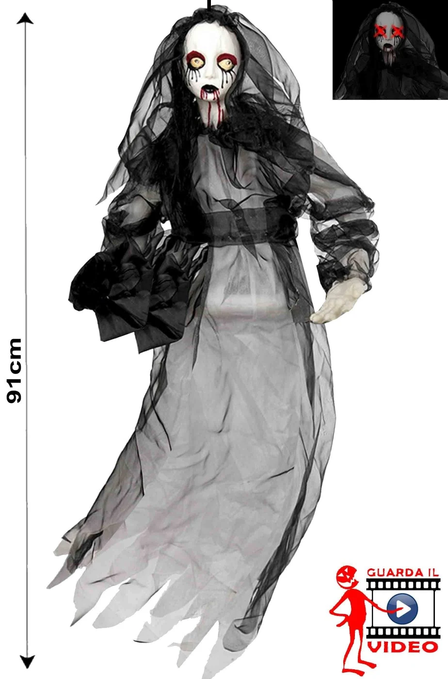 Una tra le nostre decorazioni halloween piu’ inquietanti al buio, questa bambola raccapricciante da appendere ulula come un fantasma e le si illuminano gli occhi grazie ai LED rossi. Vestita come una sposa morta con il bouquet di fiori neri in mano, Questo addobbo per Halloween da interno e’ una bambola fantasma che piange lacrime di sangue simile alla sposa cadavere del film di Tim Burton.