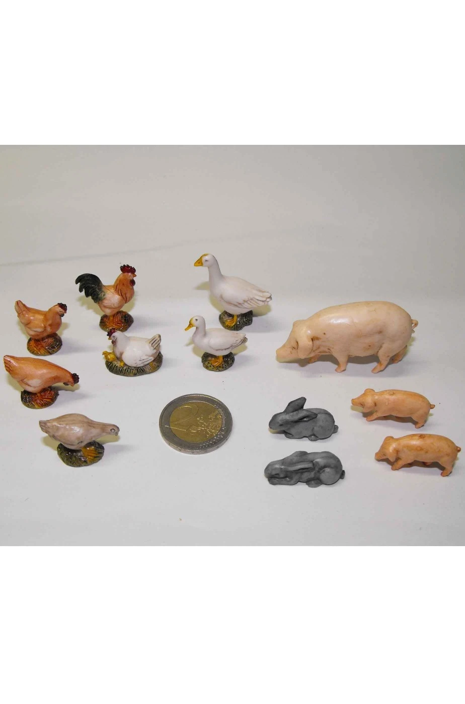 set animali della fattoria dipinti a mano: scrofa con maialini, conigli, oche, gallo, galline, pollo per presepe