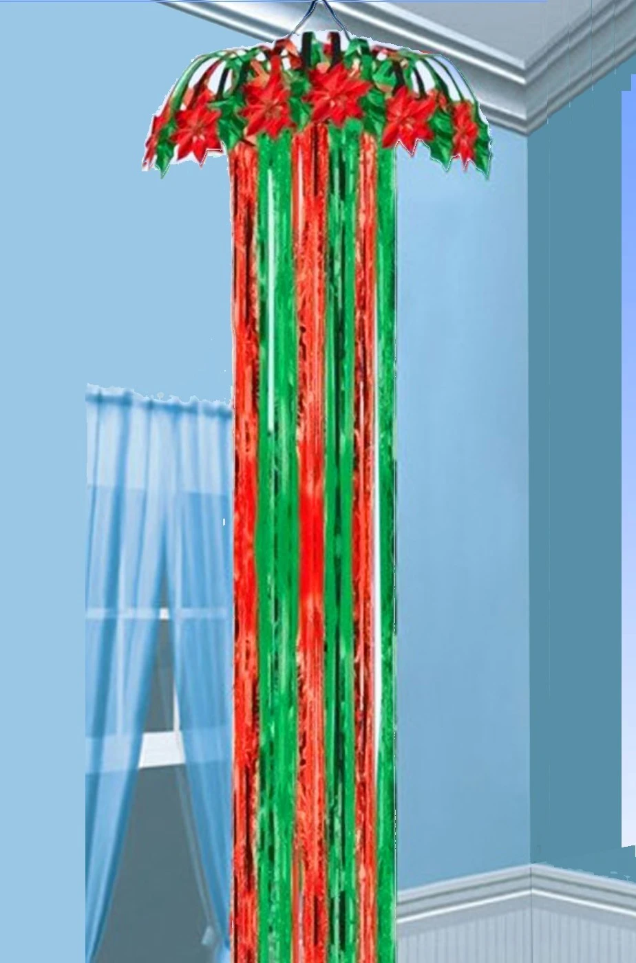 Cerchi una decorazione di Natale originale? Eccola! Una grande colonna con una esplosione di stelle di Natale e Vischio ideale per una grande sala, il salone di un ufficio o semplicemente la tua sala a Natale. Si appende al soffitto ed ecco una pioggia di nastri brillanti e colorati con i colori del vischio e di Natale rosso e verde. Alta due metri e venti.
