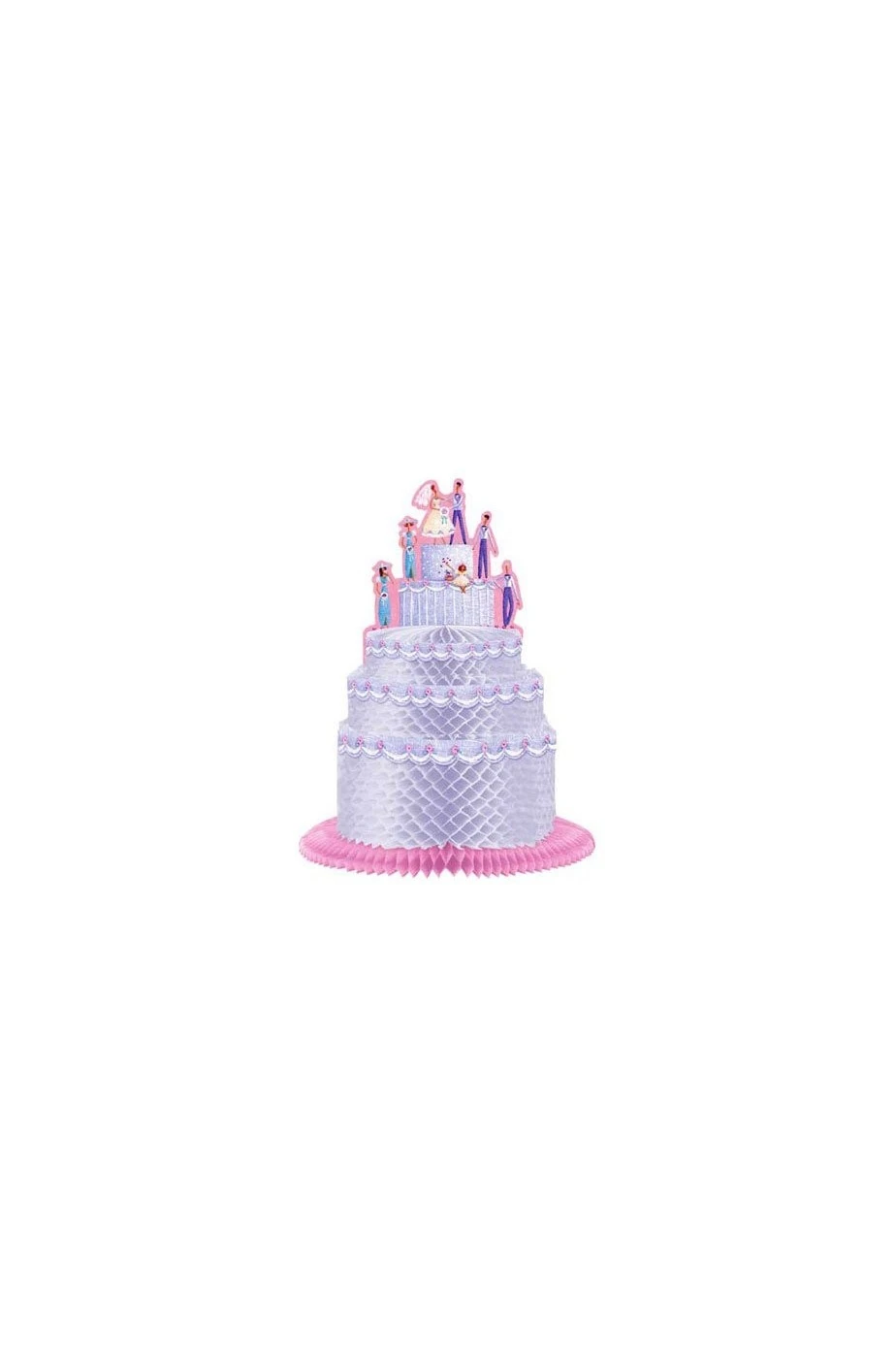 La torta degli sposi! Simpaticissimo centrotavola per gli sposi. Si apre a soffietto e diventa una bellissima torta nuziale di carta a 360 gradi tutto tondo con le figurine degli sposi, dei testimoni, e della damigella d’onore.