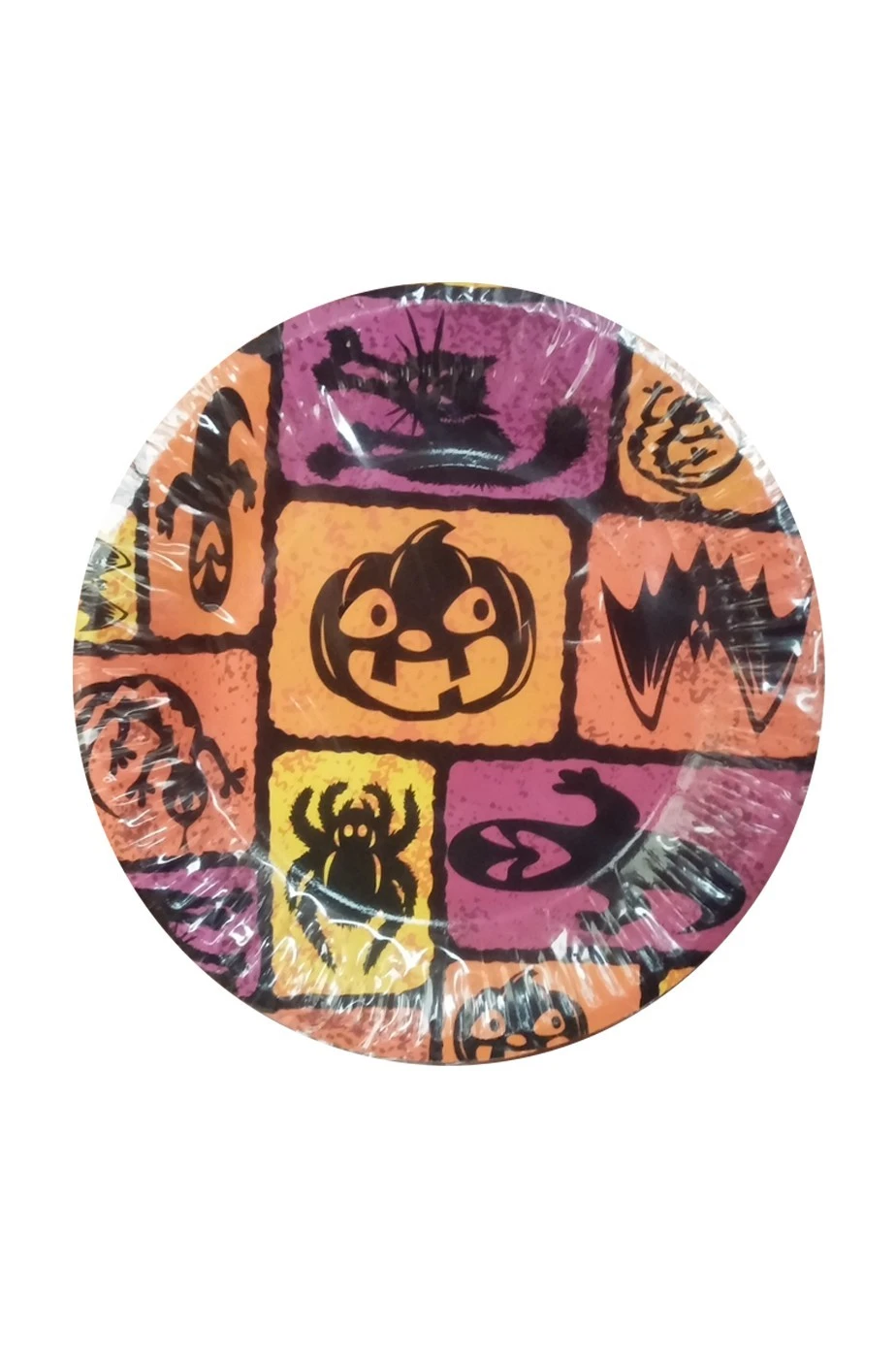Piatto di carta, confezione da 6 piatti da festa e da party Halloween multi colore con personaggi di Halloween stampati, zucche, gatti neri, pipistrelli, ragni, diametro 23cm (piatto piano da primo, secondo, pasta). Pacchetto di 6 piatti.