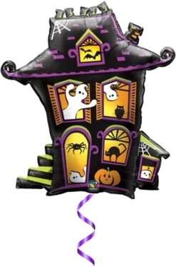 Davvero enorme, ben 80cm di altezza e 60 di larghezza, e’ un centrotavola fantastico da appendere al centro della tavola oppure come decorazione divertente per la festa di ognissanti questo grande palloncino di Halloween a grande casa stregata da gonfiare ad elio.