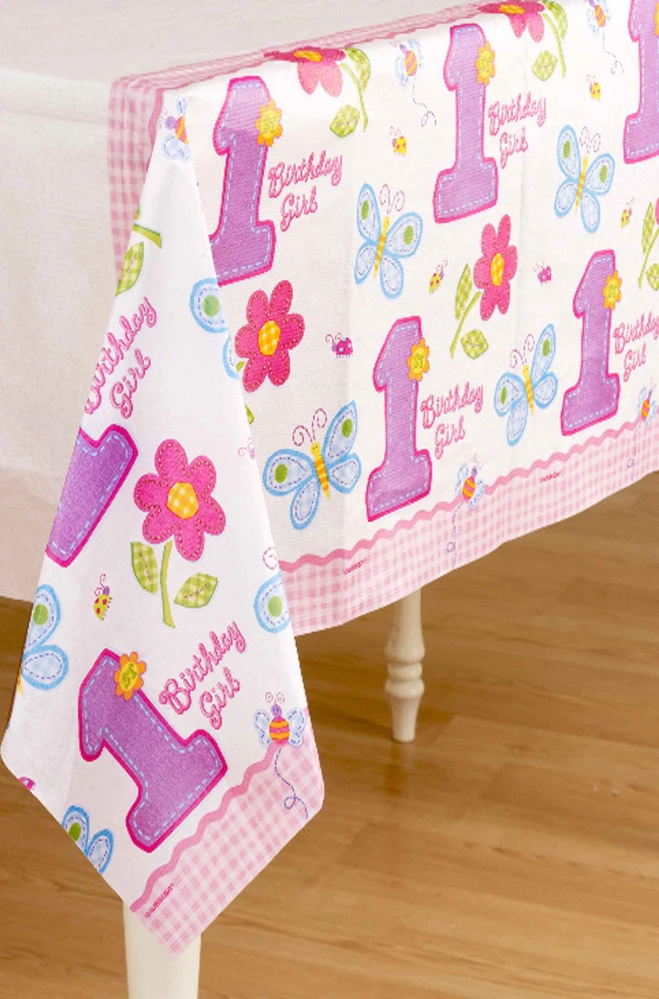 Per festeggiare il primo compleanno della tua bambina, inizia apparecchiando la tavola con quest stupenda tovaglia di carta con la stampa 1st birthday girl. Fiorellini ed animaletti la contornato e completano per un divertente addobbo della tavola da pranzo.
