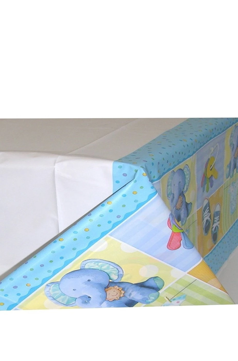 Tovaglia di plastica con simpatici elefantini per feste di compleanno bambino e party per un maschietto. Di dimensione generosa, 137 x 259, si presta ad apparecchiare la tavola per festeggiare un bel bimbo piccolo!