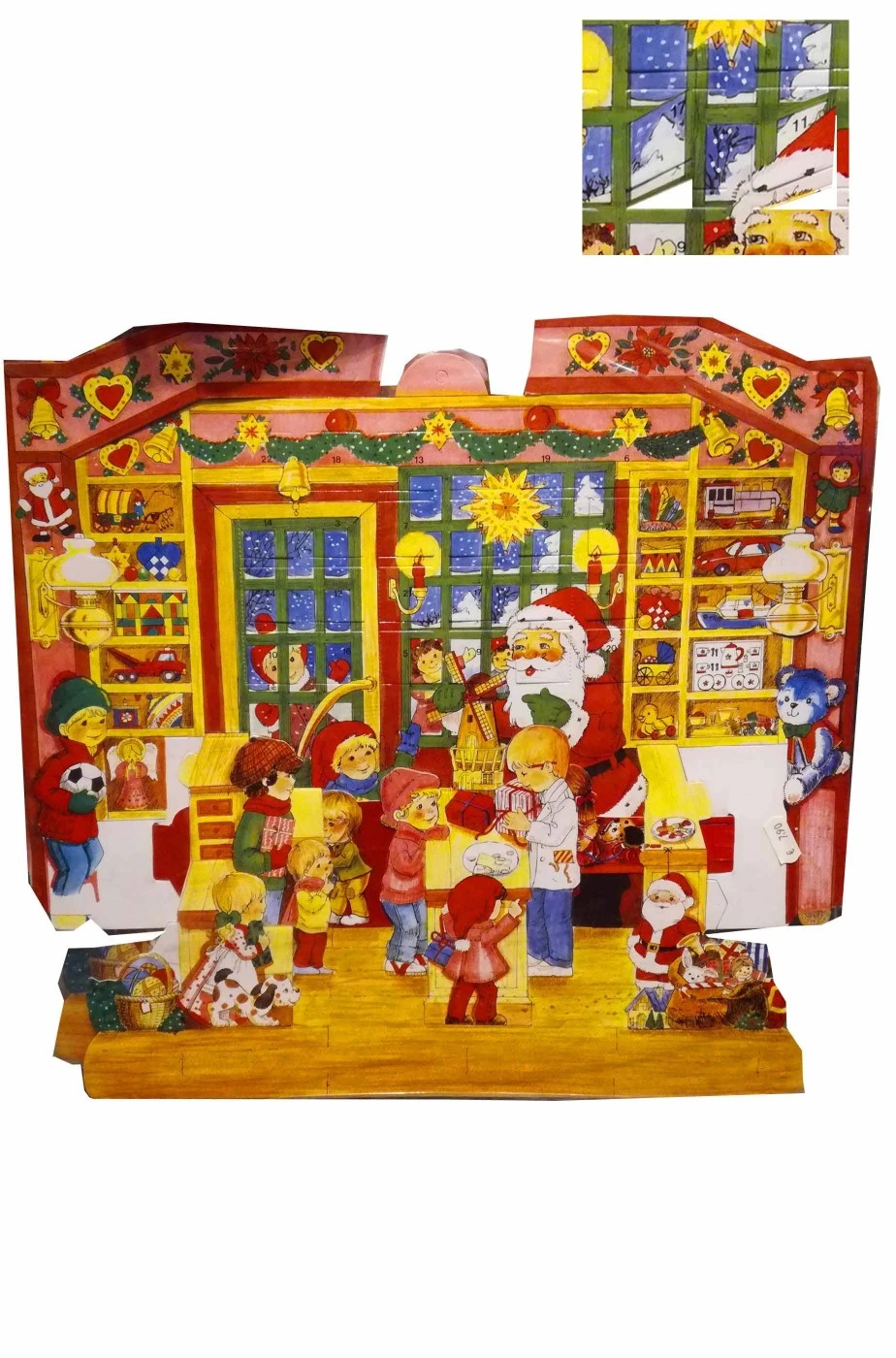 Calendario dell’avvento tridimensionale Babbo Natale che distribuisce regali ai bambini. Si apre e la scena prende profondita’. 43X40X10cm in cartoncino