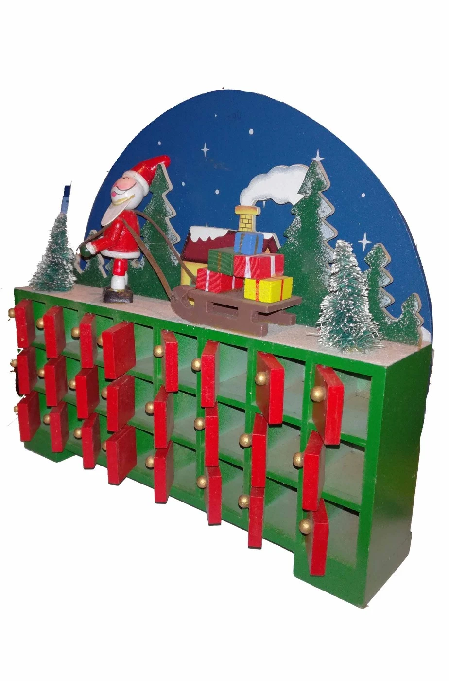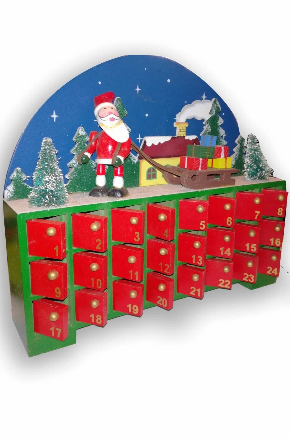 Un calendario dell’Avvento in legno riutilizzabile sempre, con 24 piccoli box con gli sportellini da aprire giorno per giorno per una nuova sorpresina. Tutto in legno con un simpatico Babbo Natale e due alberi di Natale in 3D. Dimensione 25x24x6cm. Ogni box e’ circa 2cm di lato.