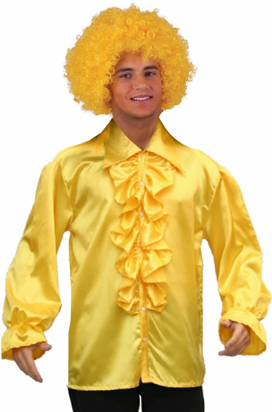Aggiungendo solo parrucca, tamburello e occhiali disponibili nel nostro negozio puoi andare alla tua festa estiva. Figlio dei fiori, hippy o vintage questa camicia gialla e’ proprio come quelle che si usavano a fine anni 60 e primi anni 70 con il colletto a punte lunghe e lo jabot a sbuffo sul petto.