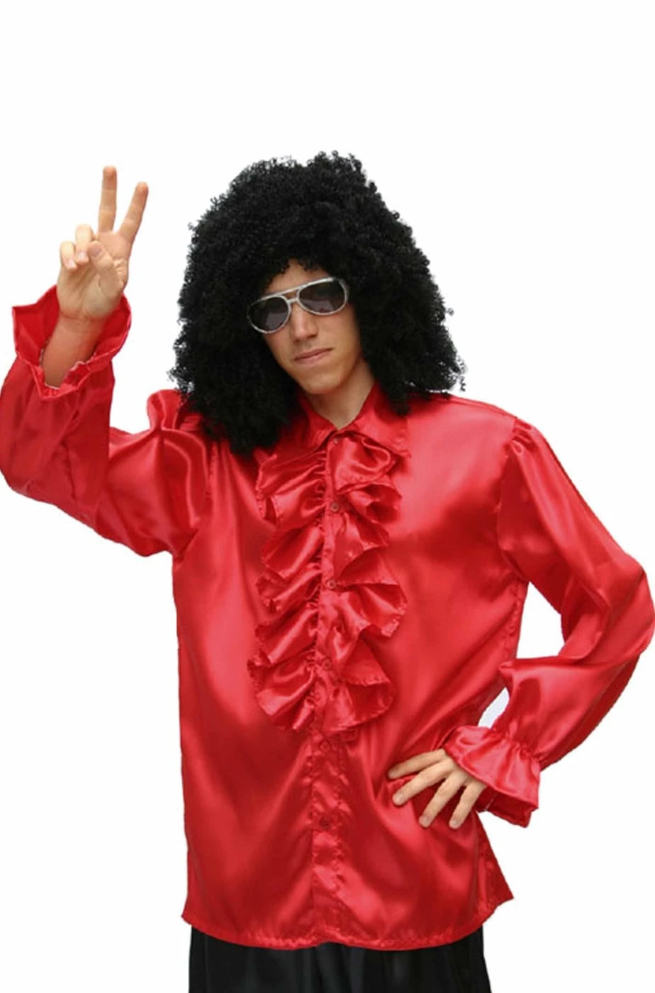 Aggiungendo solo parrucca, tamburello e occhiali disponibili nel nostro negozio potrai realizzare un costume di carnevale per la tua festa a tema anni 70 Figli dei fiori, hippy o vintage perche’ questa camicia rossa ha il colletto con le punte proprio come negli anni 70 e lo jabot a sbuffo sul petto che potrai aprire per far uscire il torace peloso.