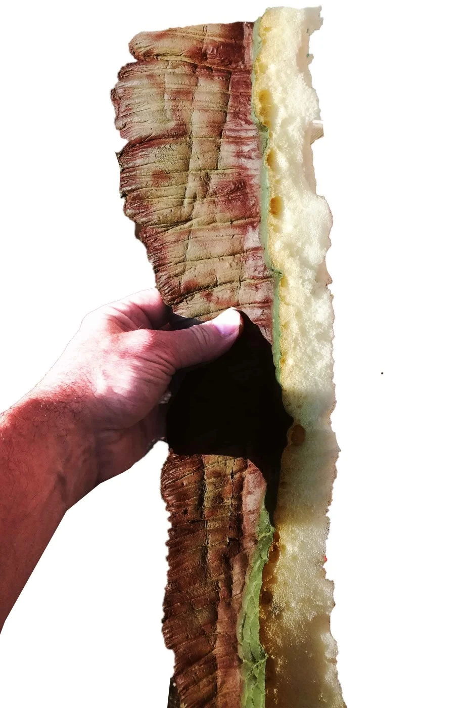 A seconda dell’uso che se ne vuole fare può essere necessario rifinirla rimuovendo la schiuma in eccesso e/o completarne la pitturazione nei punti di schiuma in vista. Rifinibile con lattice liquido o siliconici da prostetica cinematografica.
