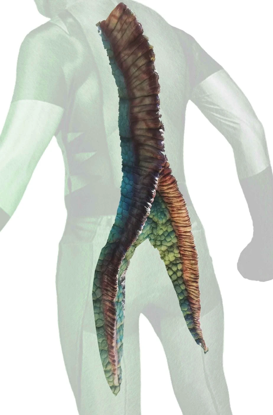 Coda bifida a due punte da rettile, coccodrillo, dinosauro o tirannosauro per completare costumi di carnevale da rettile o mostro o per scenografie ed allestimenti.