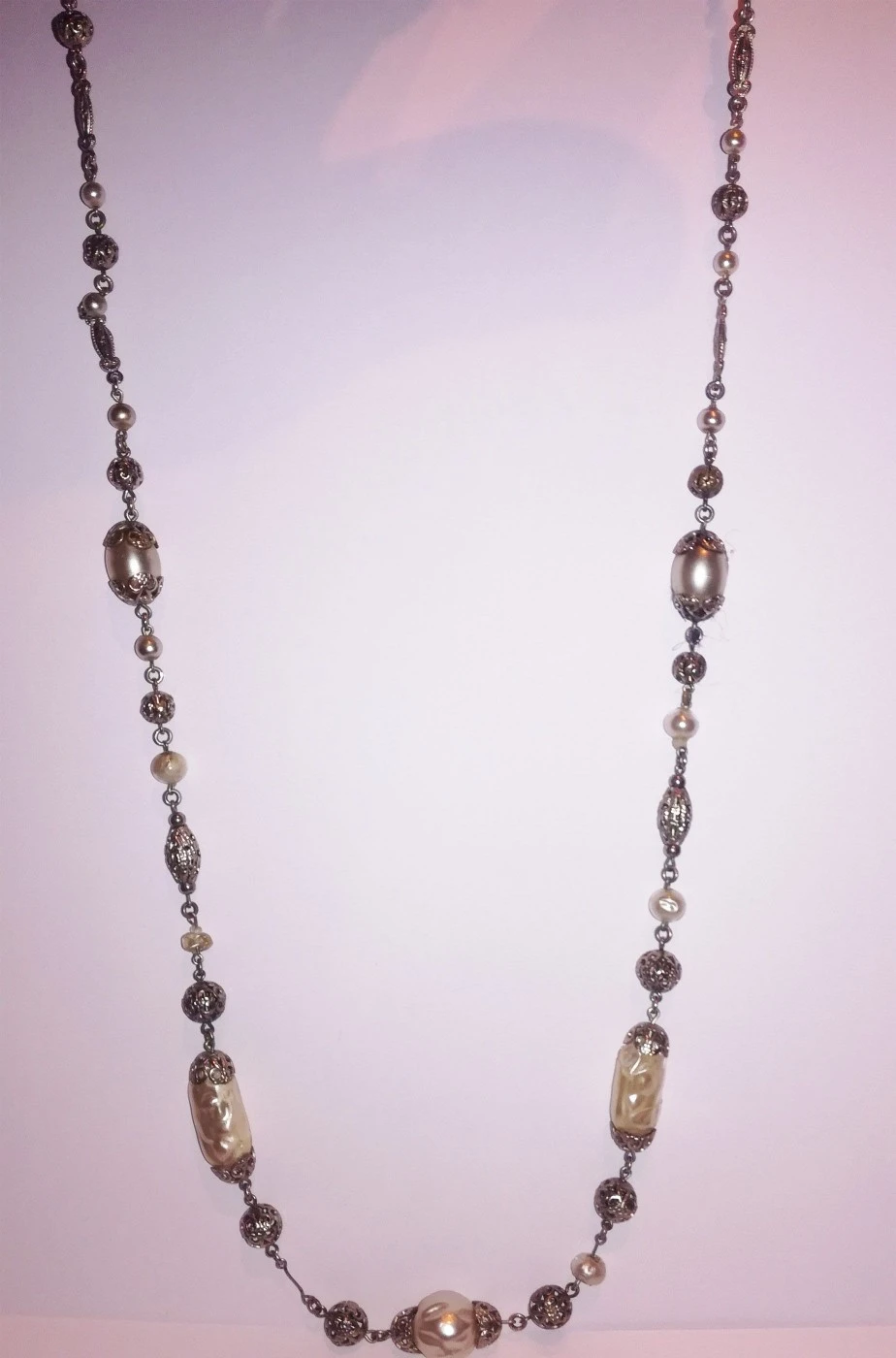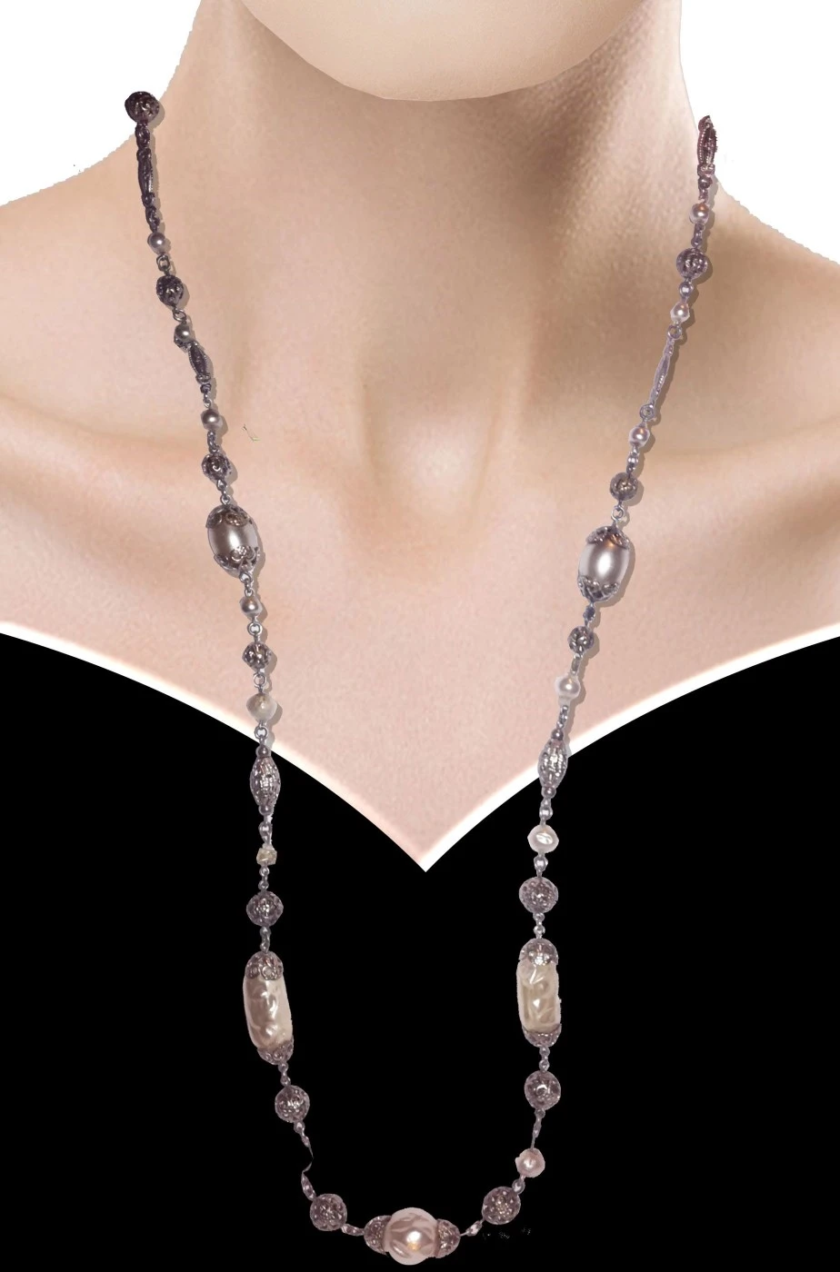 Una collana di bigiotteria di filo metallico con perle finte ovoidali che consigliamo come complemento di un costume medievale o rinascimentale perche’ questa collana ricorda i gioielli delle dame storiche. Il colore e’ argento ed il colore delle perle finte variano dal bianco al panna a seconda della luce.