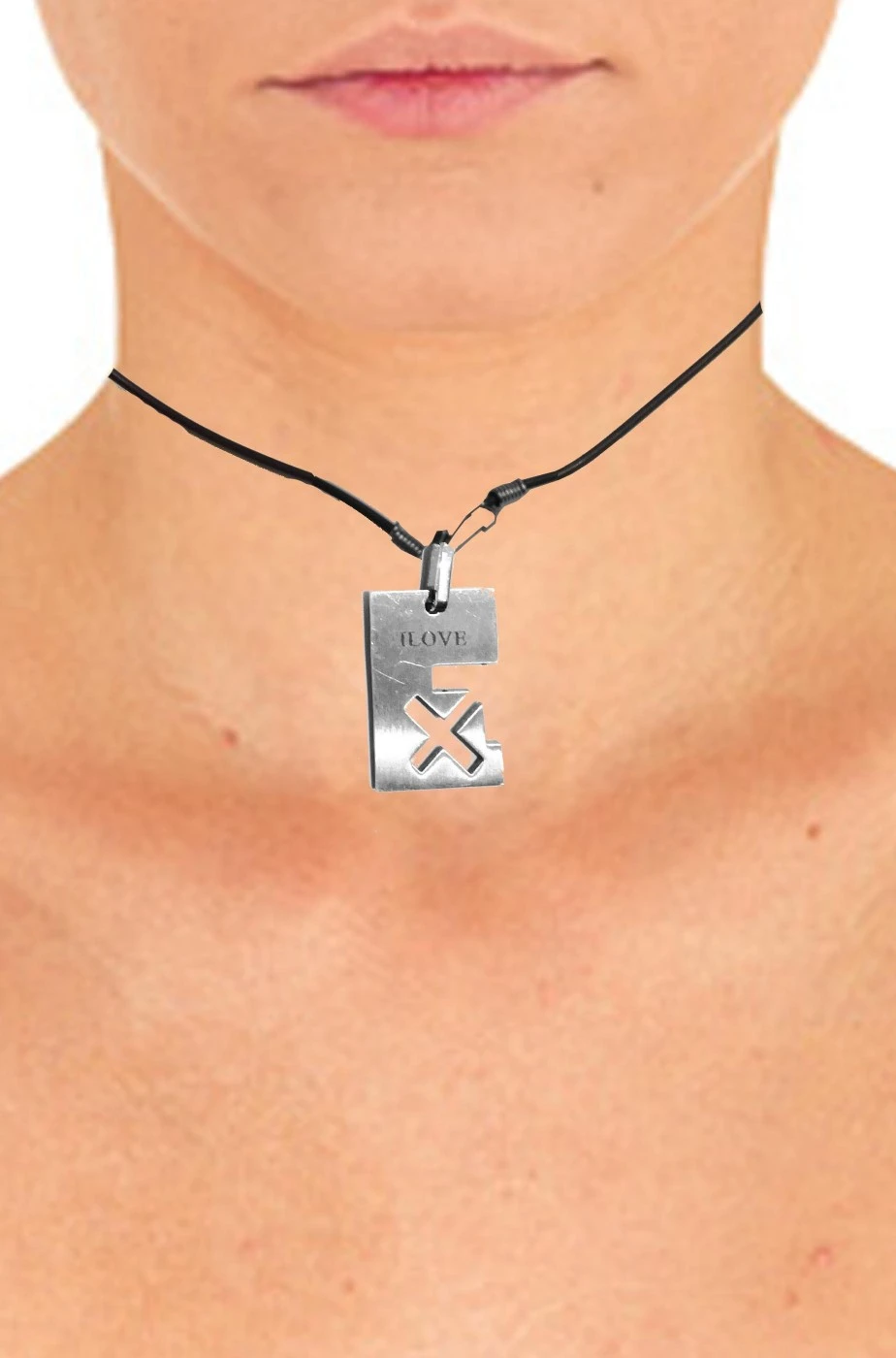 Girocollo in caucciù con ciondolo in acciaio rettangolare con grande X a intaglio e scritta I Love