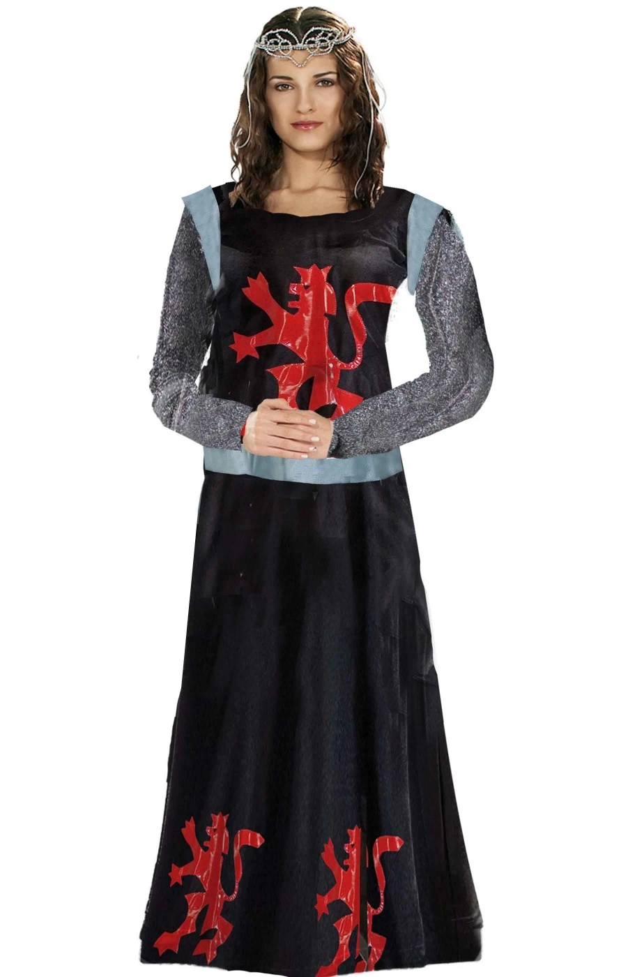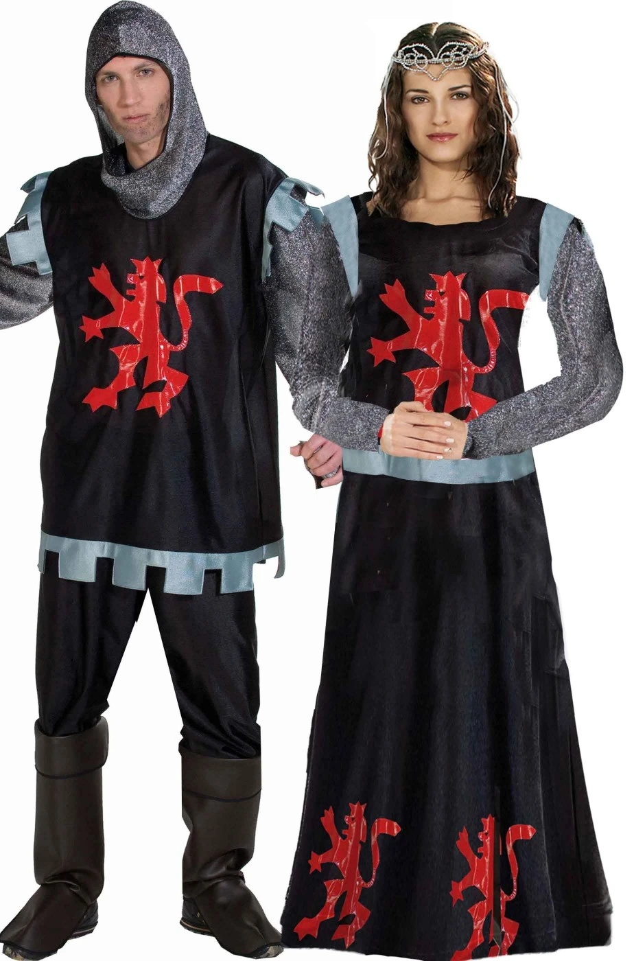 Coppia di costumi di carnevale uomo e donna in stile medievale, lui il guerriero lei la dama castellana. Il vestito di carnevale da soldato medievale da uomo e’ composto esclusivamente dalla giacca con il leone di san giorgio stampato e le maniche in finta cotta di maglia, oltre che dal copricapo sempre in tessuto finta cotta di maglia ed e’ disponibile ESCLUSIVAMENTE in taglia 48 anche se veste abbastanza largo. Il vestito di carnevale da dama medievale di lei ha gli stessi motivi con i leoni di san giorgio rossi, le maniche come nella giacca da uomo sono in tessuto che simula la cotta di maglia. Una bella coppia ad un prezzo ottimo da completare con mille accessori della nostra categoria Medievali.