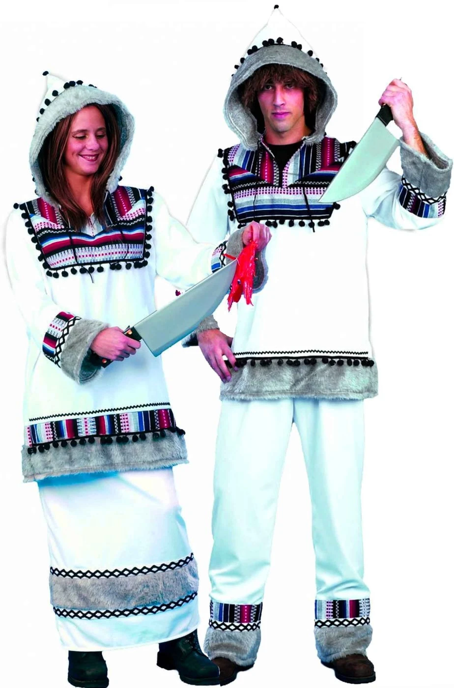 Coppia di costumi da eschimesi o esquimesi o inuit da adulti bianchi con cappuccio e bordature colorate e pelo sintetico