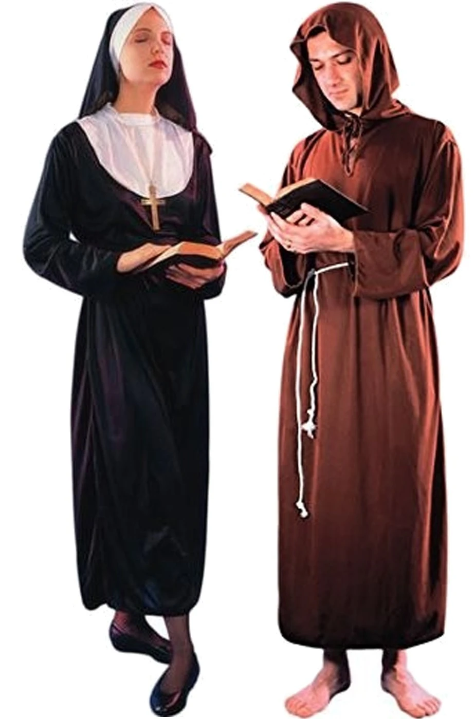 Il costume suora Include vestito, cordino e cappello a velo. Il costume da da frate include la tunica con il cordino. Croci e libri non inclusi. CONTROLLA SOTTO IL “CONTENUTO DELLA CONFEZIONE” PER VERIFICARE LE TAGLIE DEI SINGOLI COSTUMI