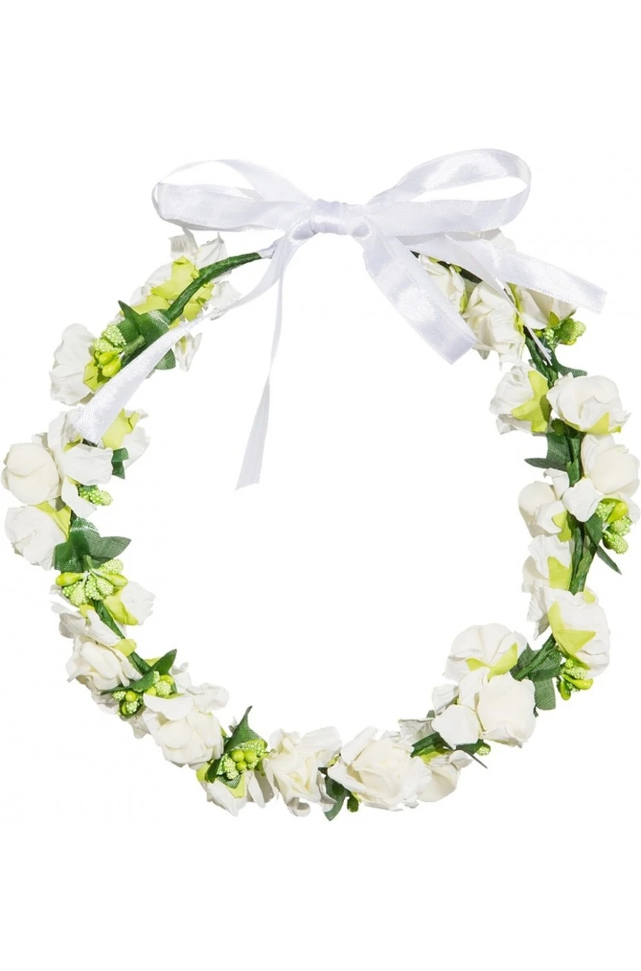 Bellissimo copricapo con roselline bianche e foglioline verdi per vestiti di carnevale da elfa dei boschi da madre natura da anni 70 da fata e molto altro.