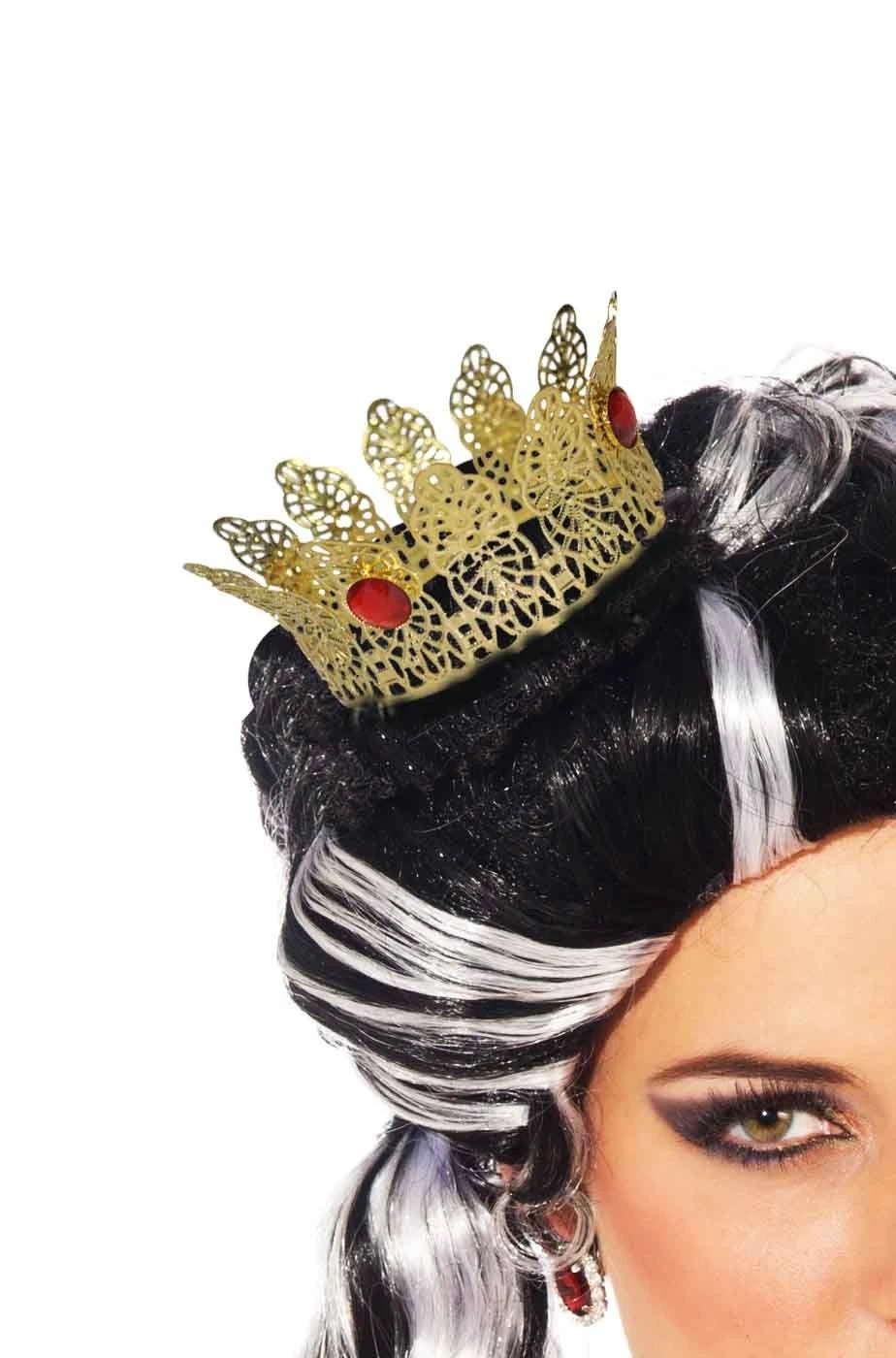 Una elegante coroncina da regina in metallo con pietre finte, perfetta per costumi di carnevale, recite o spettacoli in cui serva una regale dama. Si indossa con l’elastico incluso sia al centro della testa che in semilaterale a seconda del personaggio. E’ una corona dall’immagine davvero preziosa che completa ogni vestito da regina.
