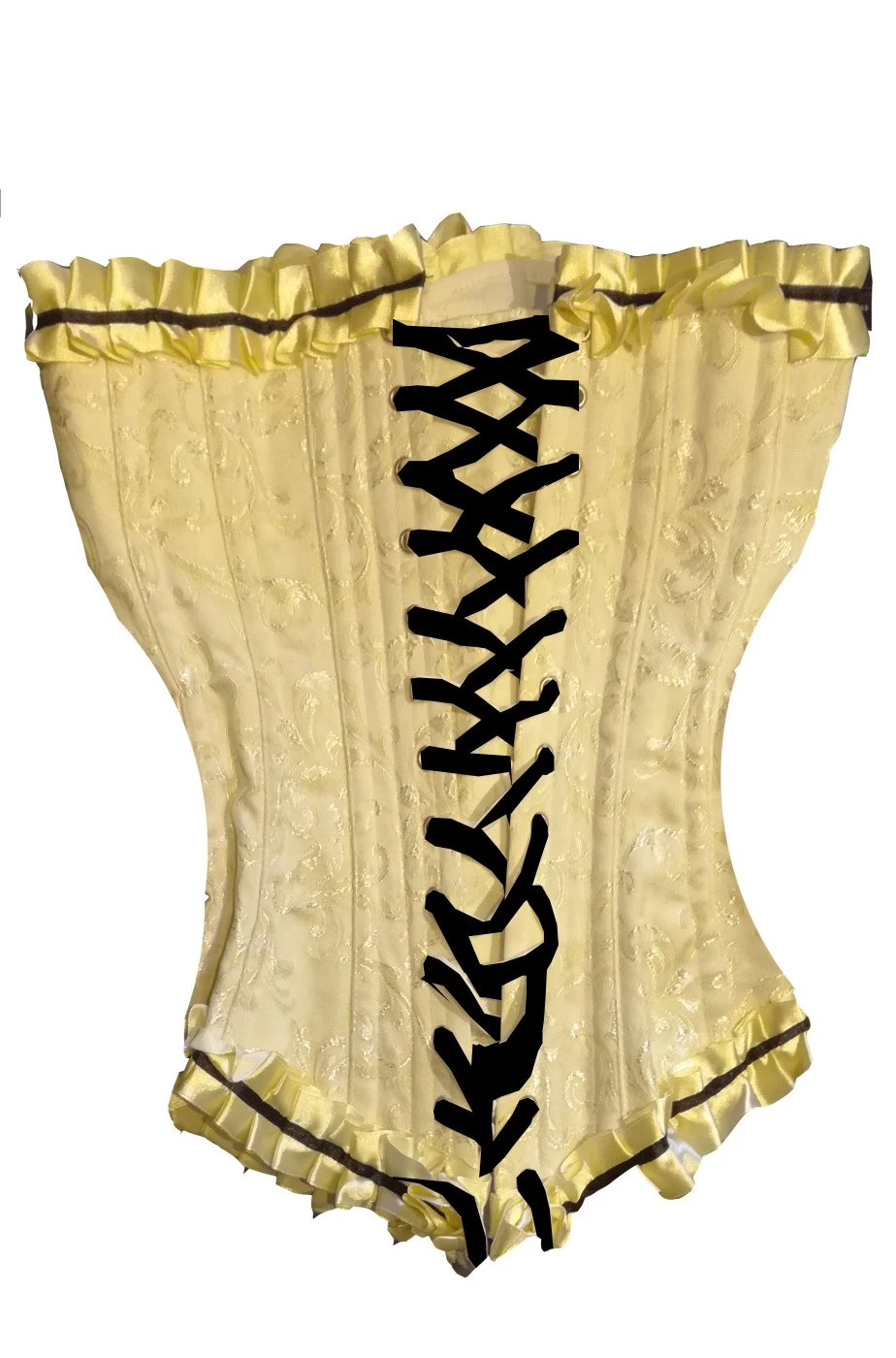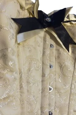 Corsetto di alta qualita’ damascato con fiocchi e stecche color crema. Bellissimo ed importante per un abito di alto livello. Si stringe e regola dietro con il cross ribbon mentre sul davanti si aggancia con i gancetti in metallo. Adornato da un grande fiocco sul decollete’ con pietra finta, è un complemento di abbigliamento estivo davvero di gran classe.