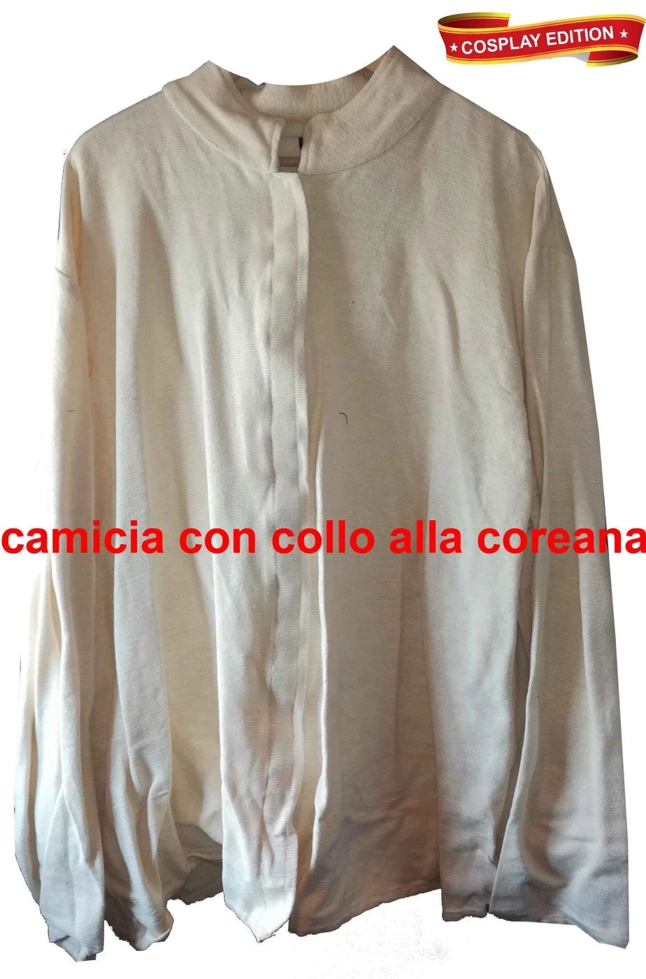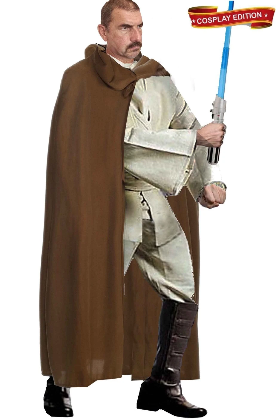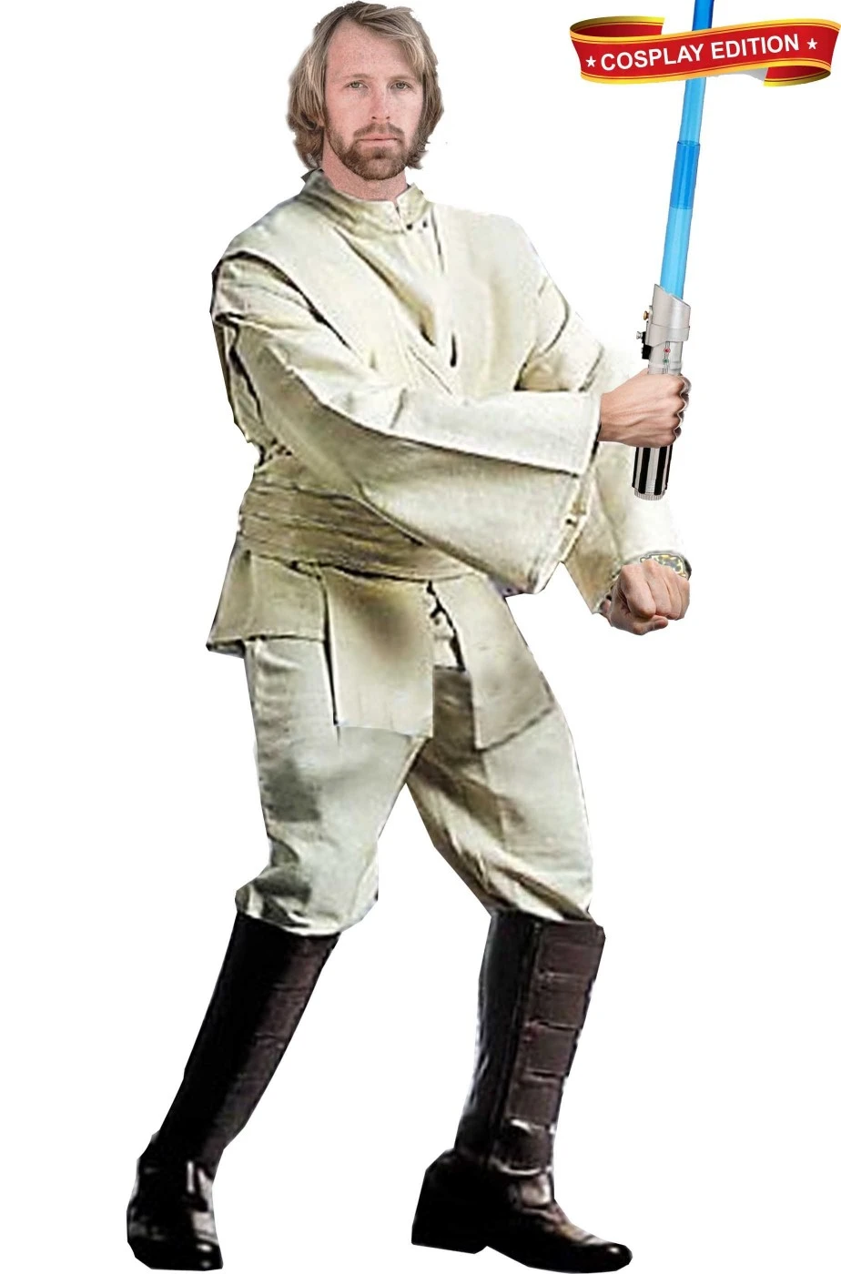 Realizzato in cotone robusto e spesso, 100%, della tonalita’ esatta di quelli indossati nella saga di film di Star Wars dai Cavalieri Jedi e quindi da Obi Wan, da Anakin, da Luke, da Mace Windu e da tutti i difensori del lato positivo della Forza, questo costume di carnevale di Obi Wan Kenobi o da Cosplay e’ composto da una camicia con colletto alla coreana con chiusura in velcro, la giacca, il pantalone ed il cinturone a fascia in cotone con le doppie fasce a tabarda da far scendere dalle spalle in avanti in un unico pezzo.