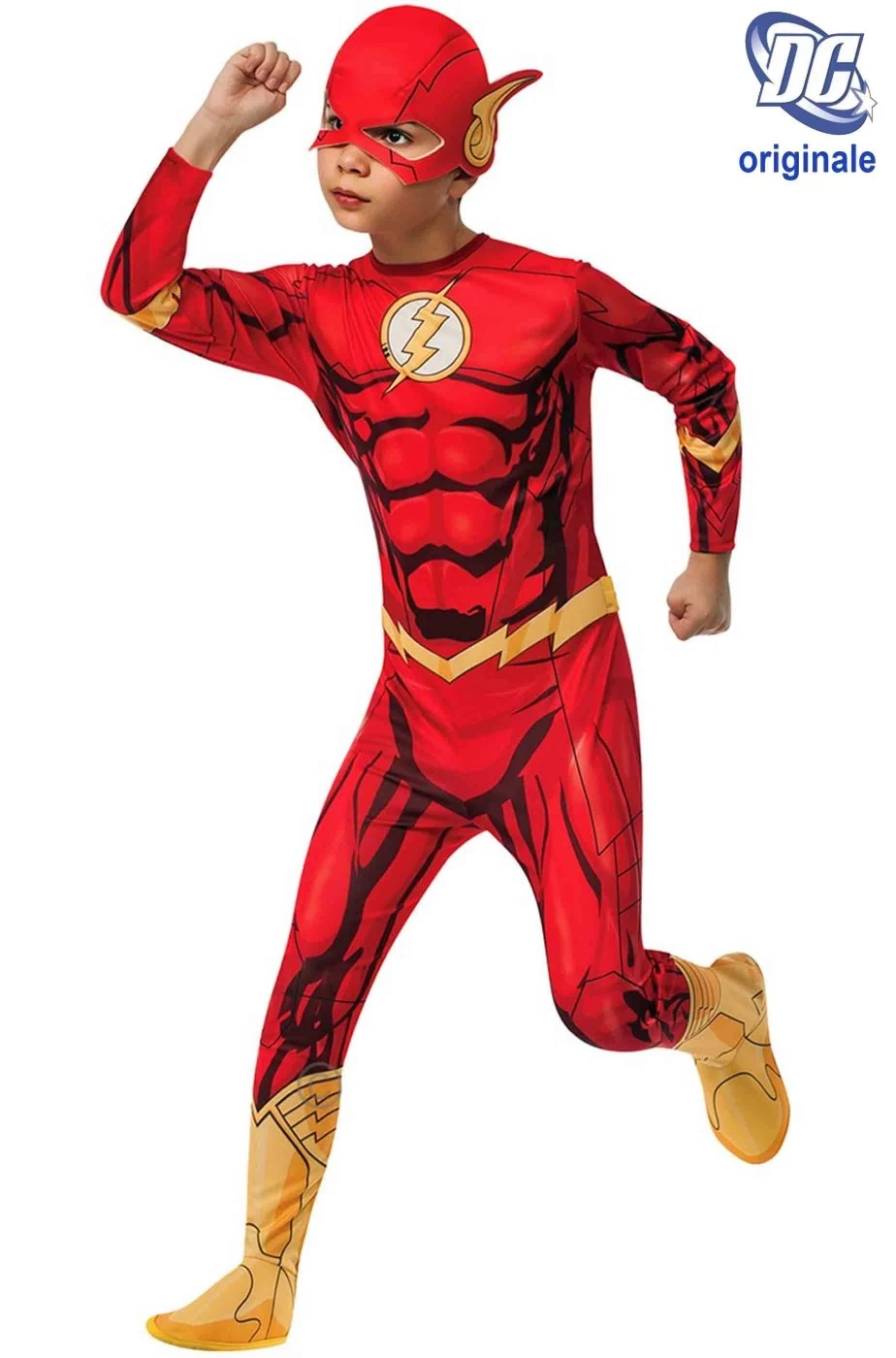 Costume di Carnevale da bambino di Flash, l’uomo velocissimo piu’ veloce della luce. Include la tuta intera con una bellissima stampa serigrafica con copristivali uniti e la maschera.