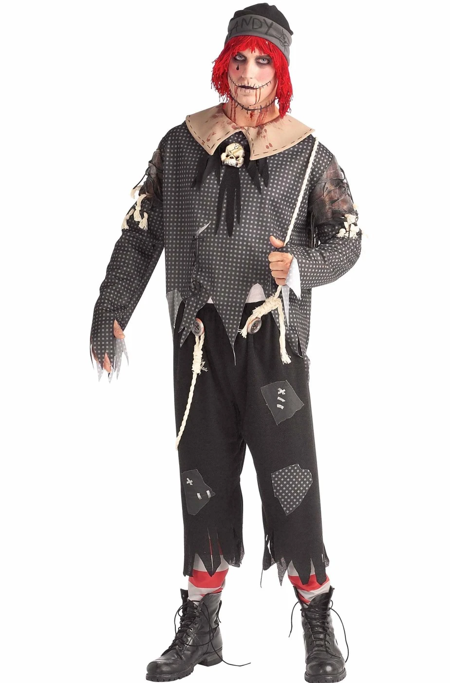 Include il pantalone con le bretelle, la camicia e perfino il cappello con i capelli a spago come un vero bambolotto questo vestito da uomo per Halloween da bambolotto dell’orrore. Spaventoso ed inquietante, un costume Halloween davvero completo.