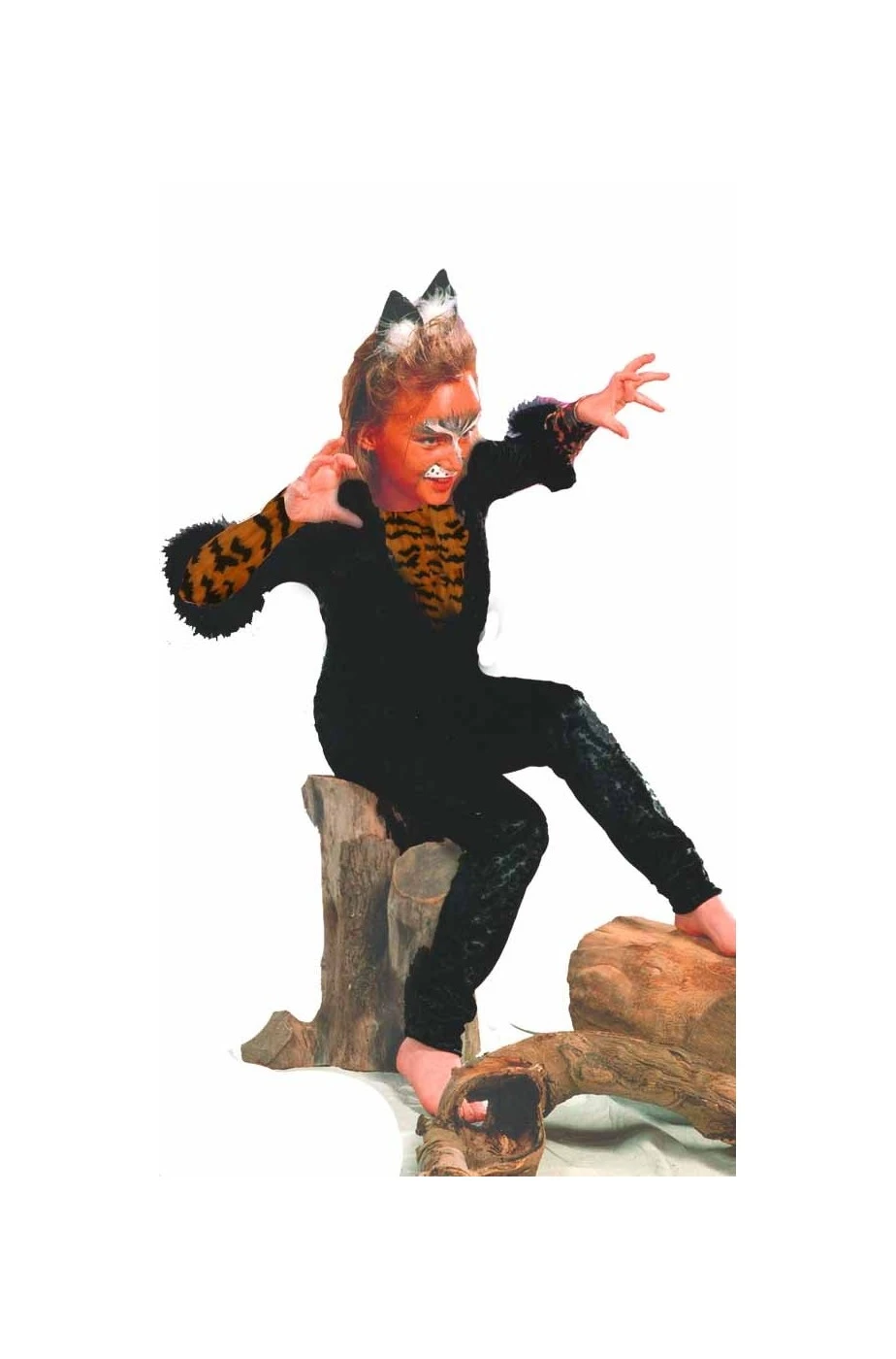 Costume di carnevale da bambina tigre: include tuta nera in ciniglia con inserti tigrati e marabou