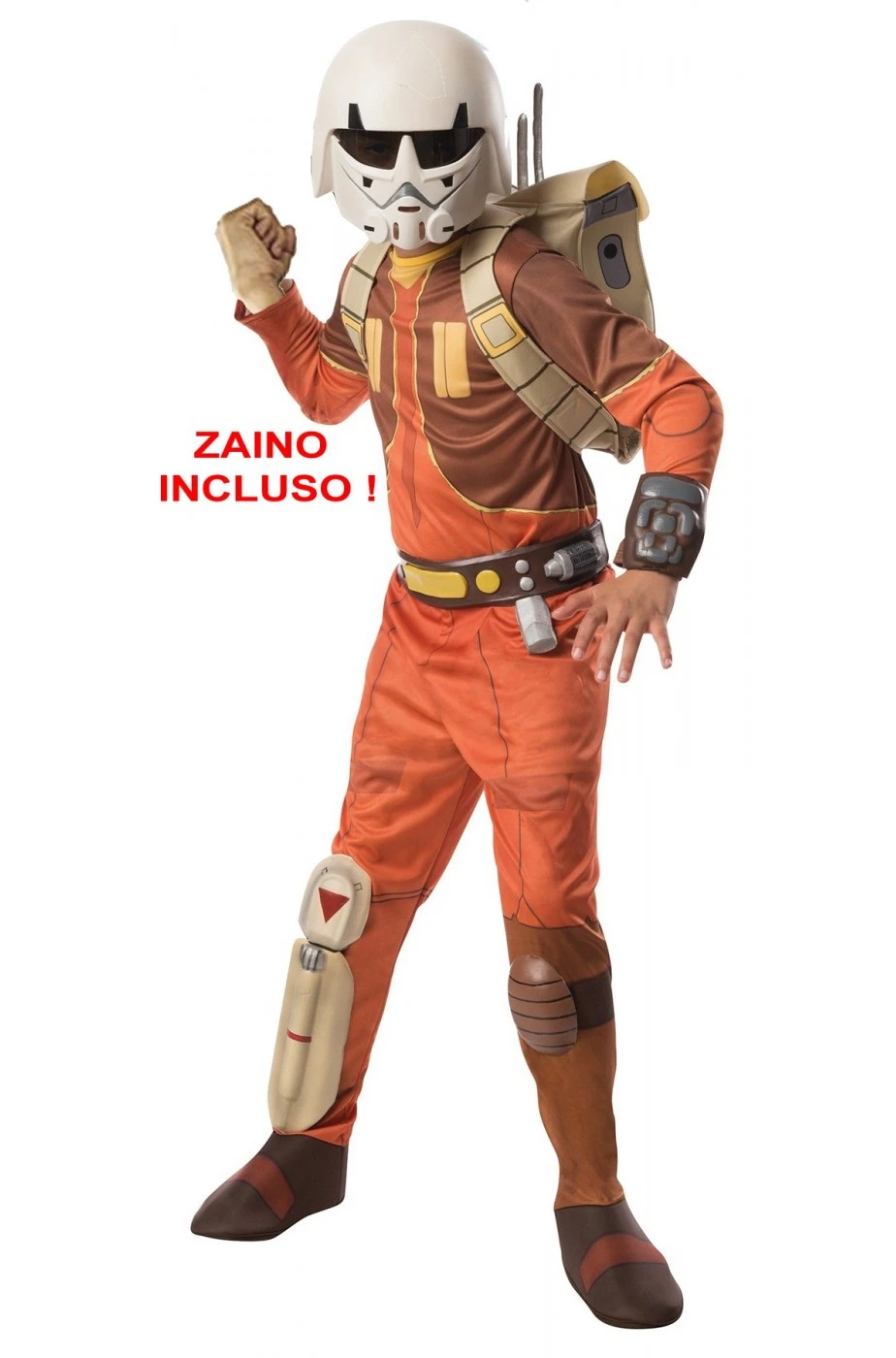 Il costume di Ezra, il giovane ladro ribelle in cui scorre potente la forza, protagonista della serie a cartoni animati Star Wars Rebels. Include la tuta con parti morbide di armatura (in EVA), e copriscarpa, cintura, zaino per la refurtiva e maschera.