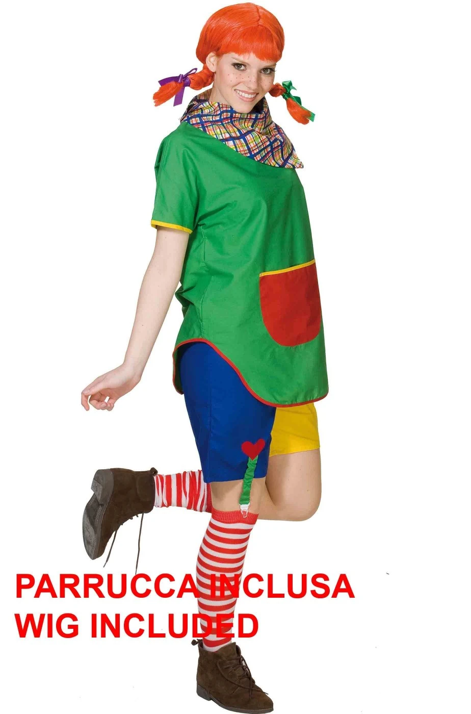 Questo vestito di carnevale include maglia, pantaloncino e parrucca. La calza non e’ inclusa