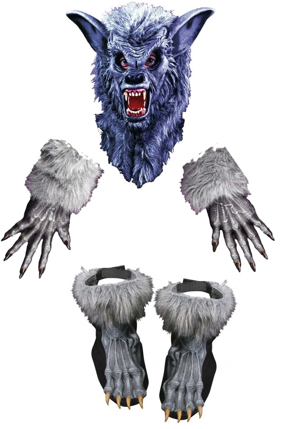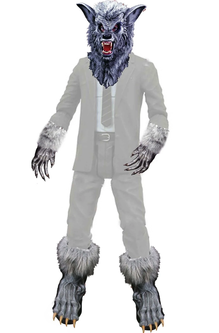 Molto comodo perche’ ti consentira’ di vestirti come vuoi, magari con un bell’abito elegante per dare maggior contrasto ed esaltare il personaggio, in versione da lupo tradizionale, in versione licantropo prendendo vecchi vestiti e stracciandoli oppure in versione lupo cattivo ma gentiluomo in giacca e cravatta come i lord del film Wolf la belva e’ la fuori questo set per vestito di carnevale da lupo grigio o lupo mannaro per Halloween e’ composto da una splendida maschera in lattice con criniera in pelo folto con sguardo da lupo grigio con i denti aguzzi, i guanti in tessuto elasticizzato con dita in PVC applicate sulla parte superiore, pelo finto intorno ai polsi e sovrascarpe con le zampe in PVC e pelo grigio finto.