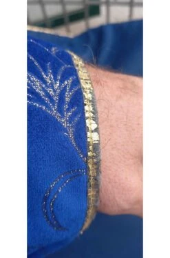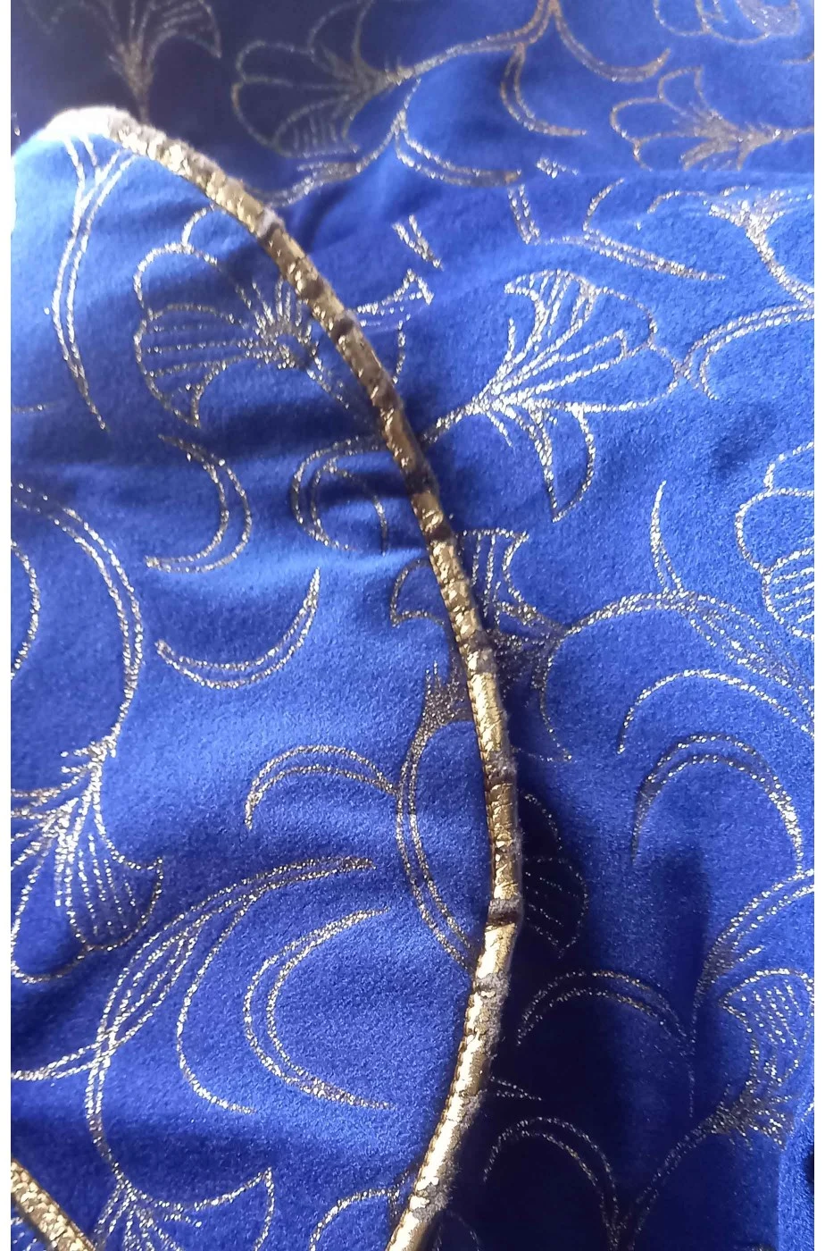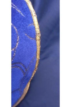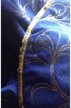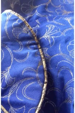 Si tratta di un vestito sartoriale realizzato a mano in Italia quindi niente cineserie, da una delle ultime sartorie carnevalesche italiane. Il tessuto e’ davvero molto bello, peccato che durante l’esposizione i bordi di rifinitura si siano screpolati come puoi vedere dai primi piani che abbiamo pubblicato come foto accessorie ma come puoi vedere il costume fa sempre la sua bella figura anche perche’ il tessuto e’ di un bel damascato oro su blu ed il cappello e’ davvero enorme (ATTENZIONE: NELLA FOTO E’ RIEMPITO CON CARTA PER RESTARE DRITTO: IL CAPPELLO NON HA ANIMA DI METALLO QUINDI SE NON LO RIEMPI CON CARTA IL CAPPELLO SI PIEGA).