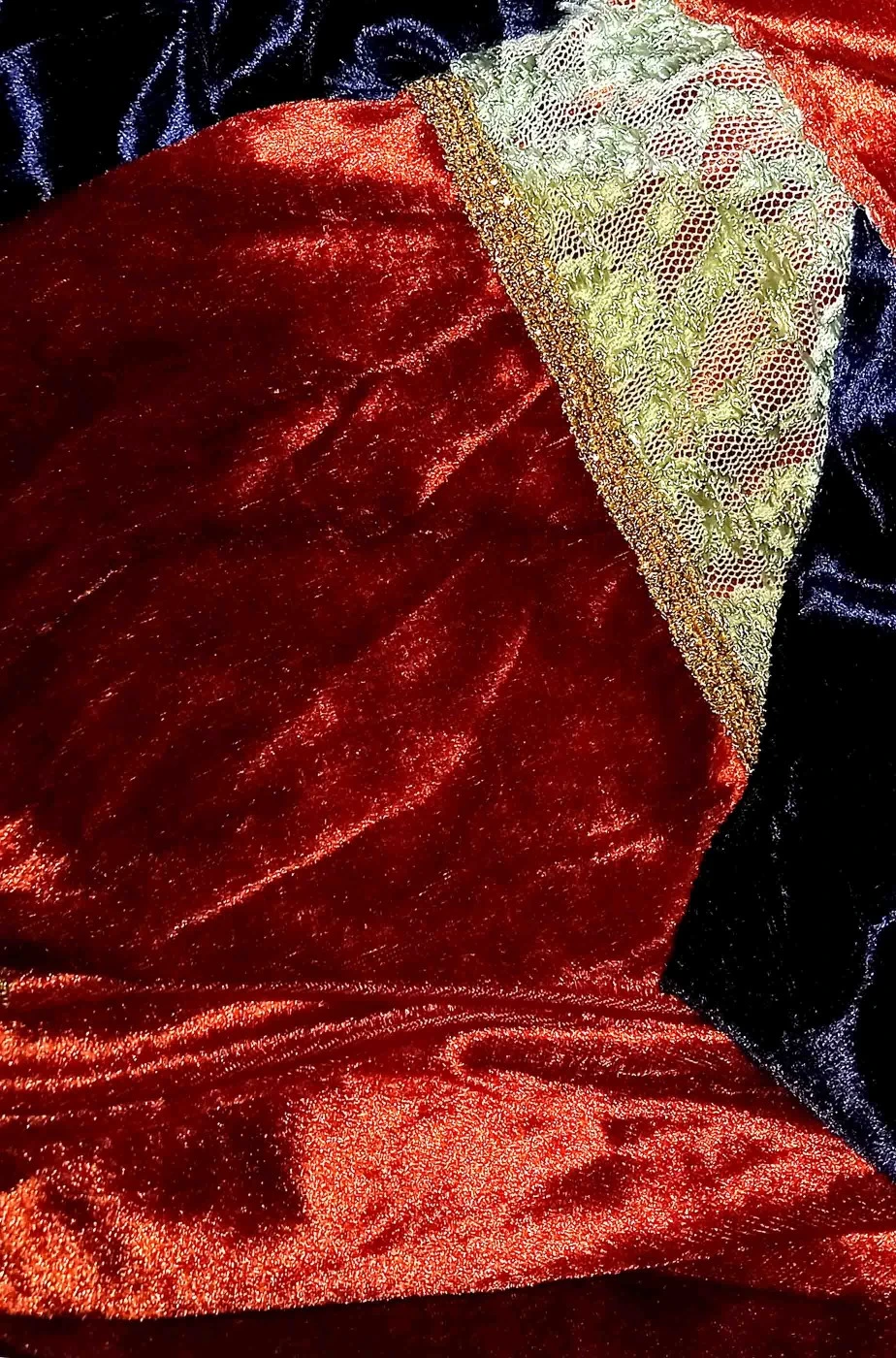 Per prima cosa bisogna parlare dei colori di questo abito perche’ costituiscono una combinazione stupenda. La struttura principale e’ costituita da una morbida ciniglia che sembra velluto al tatto di un blu profondo e cangiante che crea mille riflessi nei chiaroscuri della foresta intorno a Gran Burrone. Le maniche di questo vestito di Arwen Undómiel sono invece di un brillante color mattone elegantissimo come si conviene alla figlia del piu’ potente ed importante tra gli elfi.
