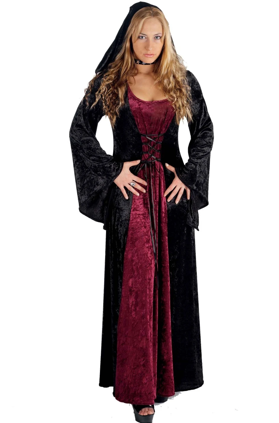Abito che include solo il vestito con il larco cappuccio in stile da vero personaggio medievale di ogni serie fantasy da trono di spade al signore degli anelli alla perfida Grimilde sino alle streghe di Salem
