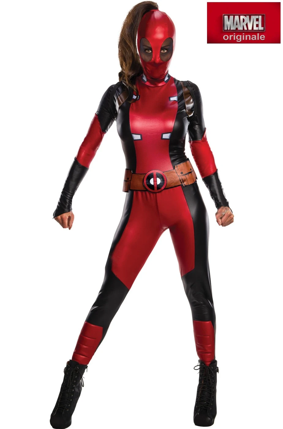 Deadpool, un vero supereroe moderno, uno che non si fa prendere il cuore dal politically correct bensì affronta i nemici per quel che si deve, senza se, senza ma, senza galanteria ma solo l’idea di eliminarli, è sempre amato dalle donne di tutto il mondo. E non c’è cosa migliore per sentirlo vicino che indossarne i panni. Ecco allora il costume di Deadpool in versione femminile, il vestito di Deadpool da donna. Uno dei personaggi Marvel più amati dai Cosplayers. Include tuta intera, cintura e maschera. Una tuta attillata un abito di di carnevale per feste a tema film