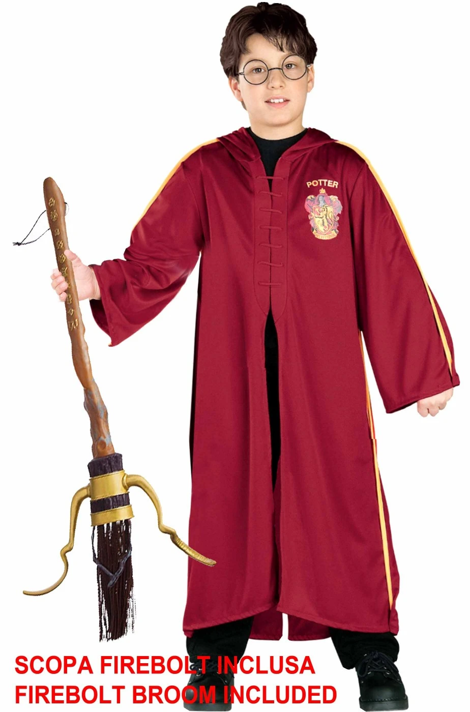 Proprio per realizzare un regalo per il tuo bambino completo ed entusiasmante, abbiamo messo a pacchetto sia il costume di Harry Potter da Quiddich composto dalla tunica rossa scura come quella della casata principale di Hogwarts con il marchio Grifondoro (attenzione: e’ scritto Gryffindor in inglese) con ll cappuccio come quella del cercatore di boccino d’oro piu’ famoso del mondo dei maghi e della scopa da volo (non vola) di plastiica originale Warner Bros riproduzione della scopa da volo Firebolt.