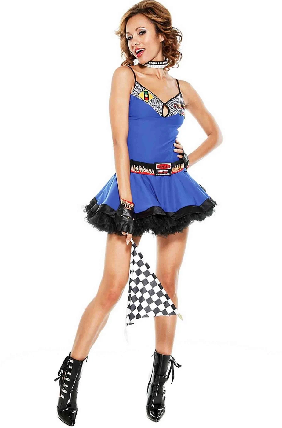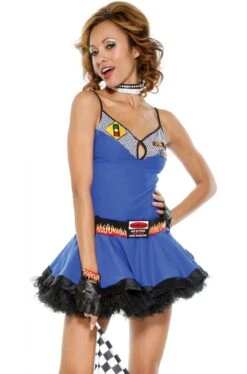 Finalmente un costume di Carnevale originale questo vestito da ombrellina Starter Girl delle corse di Formula 1 con la cintura in stile cars con le mille fiamme. Di altissima qualita’, in tessuto elasticizzato, originale Forplay, la casa che veste le stars di Hollywood, questo costume da ombrellina include il vestito, i guanti, la cintura e la bandierina a scacchi bianchi e neri.