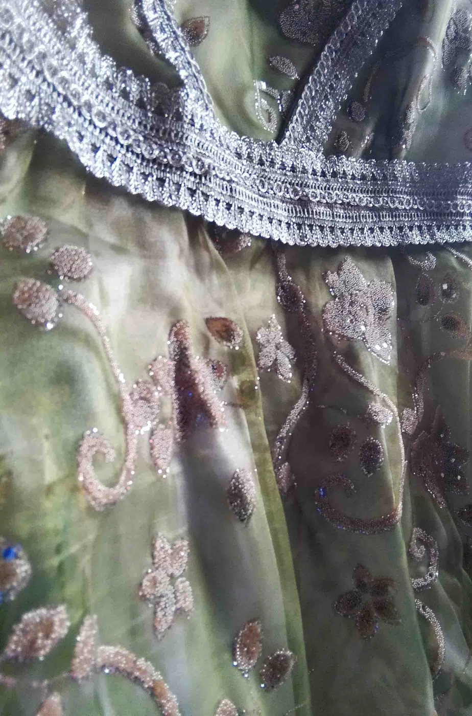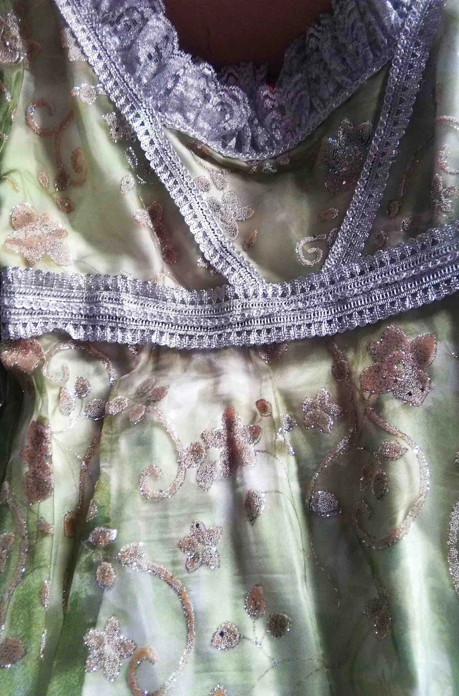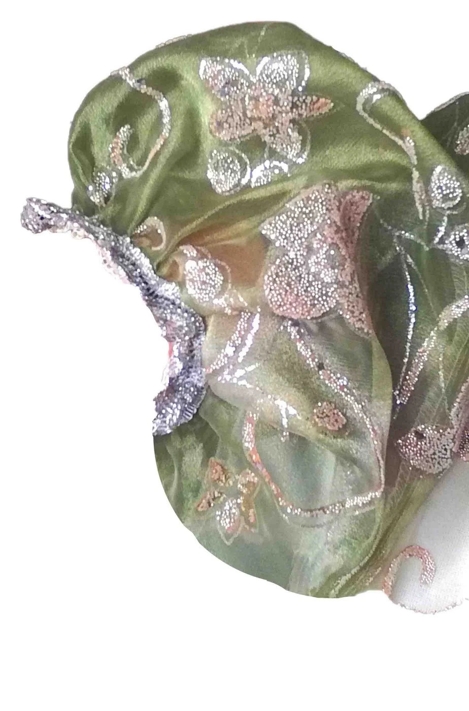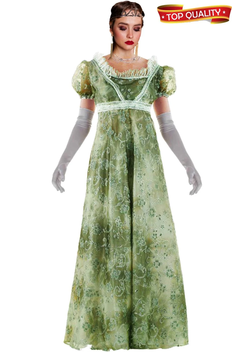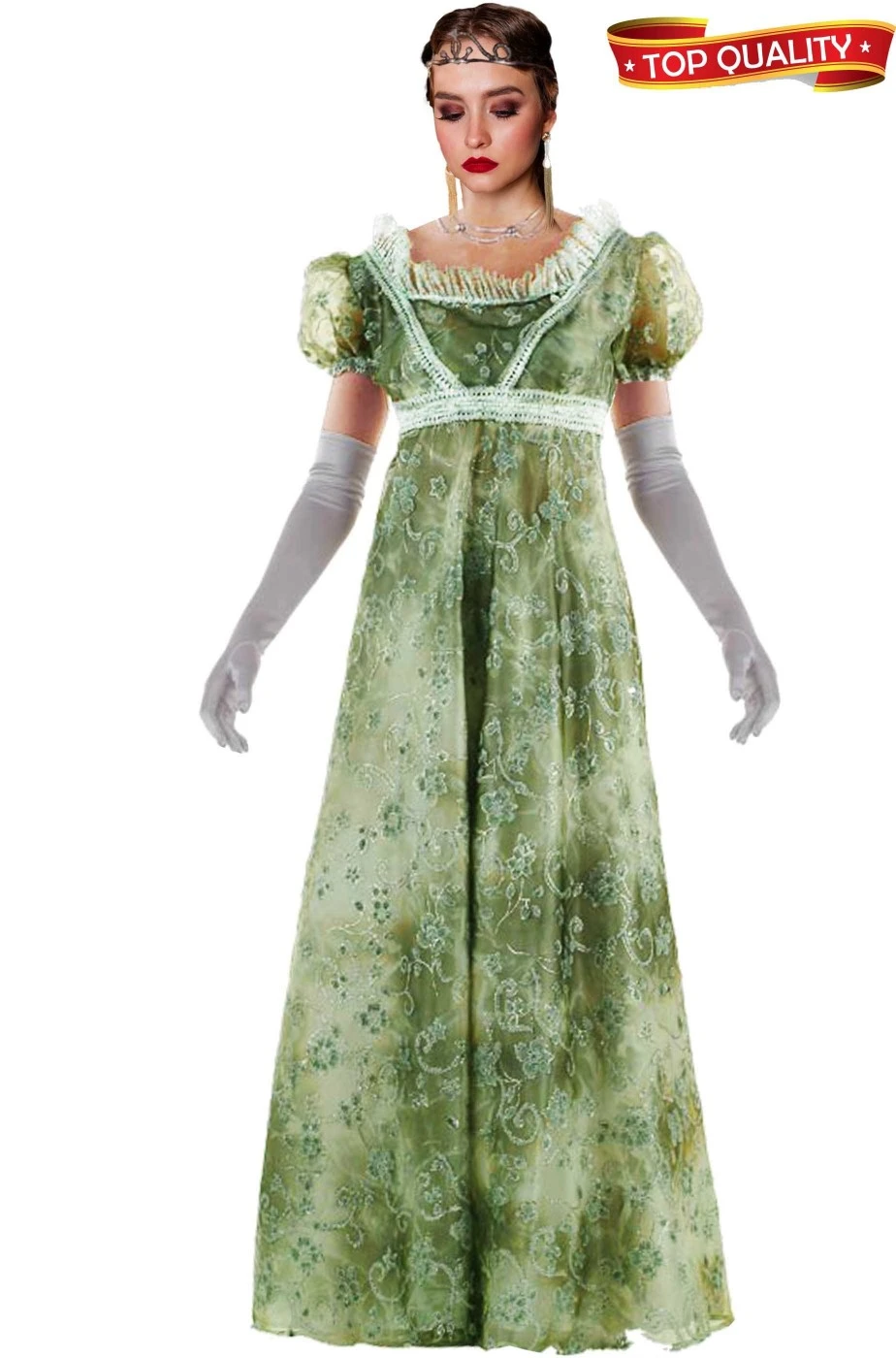 Infatti questo vestito Josephine Bonaparte, in stile fine 700 primi 800, e’ un abito verde realizzato in due strati: uno inferiore di un bel color verde muschio ed uno strato di tessuto trasparente verde sovrapposto, con la consistenza dell’organza, con stampate decine di fiori e foglie argentati in rilievo che rendono il vestito adatto anche come meraviglioso costume da elfa dei boschi o come abito da principessa o dama dei tempi di Napoleone proprio come l’imperatrice Giuseppina Bonaparte.