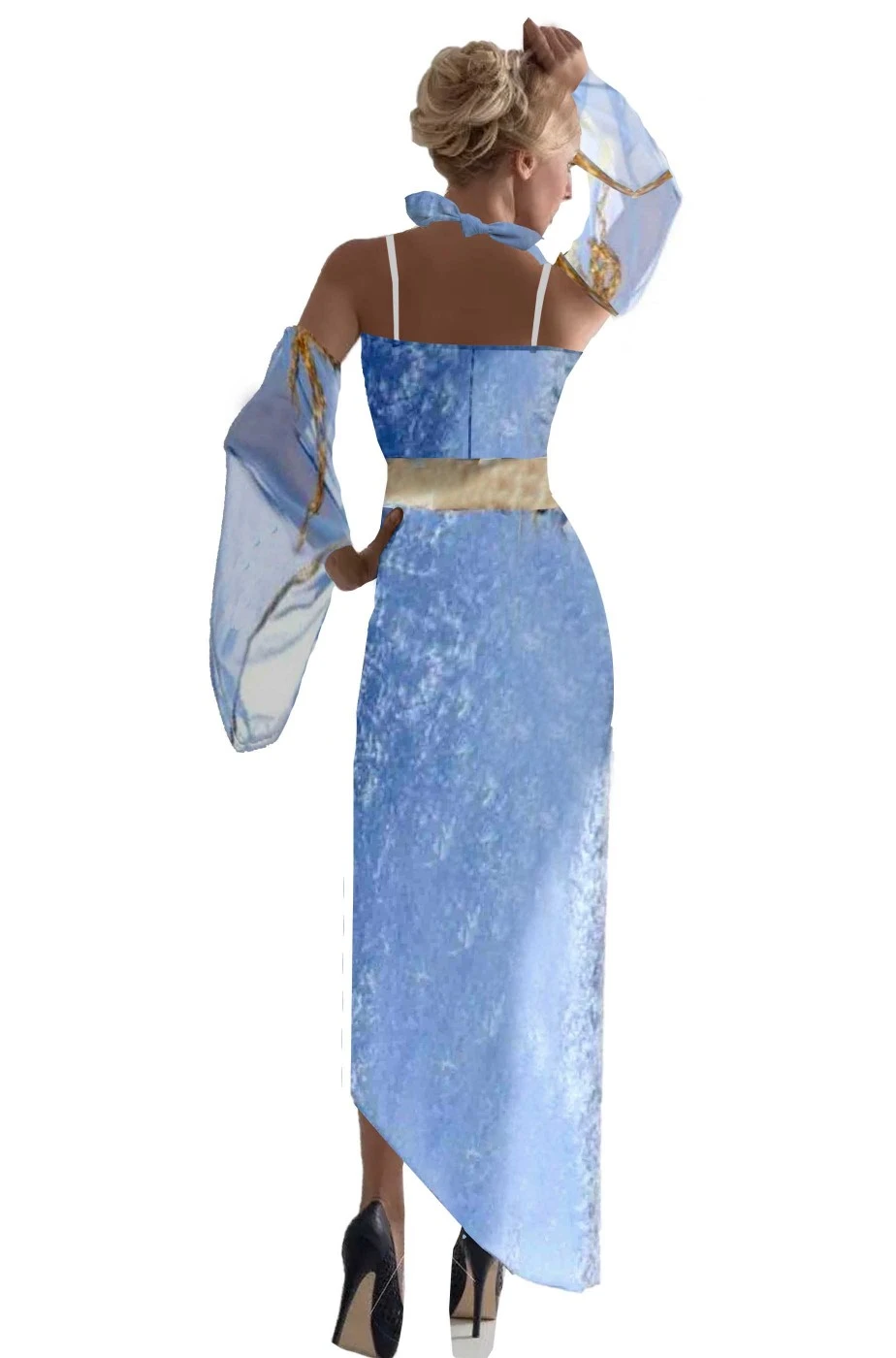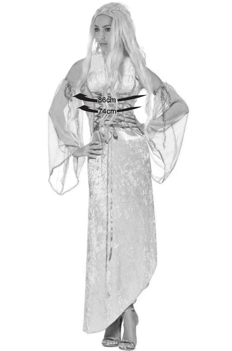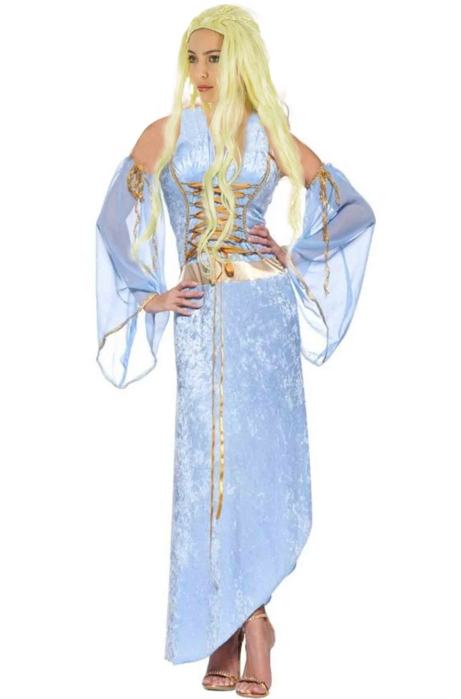 La madre dei draghi, Daenerys Targaryen, interpretata da Emilia Clarke nella serie TV fantasy di piu’ grande successo, Trono di Spade, titolo originale Game of Thrones, ha indossato moltissimi e meravigliosi costumi di alta qualita’ ed eleganza. Per realizzare un tuo cosplay di Kalheesi Madre dei Draghi, ti proponiamo questo pacchetto composto da un bellissimo abito azzurro in stile medievale con le ampie maniche separate a manicotto che ricorda molto uno degli abiti azzurri indossati da Emilia Clarke ed una parrucca bionda lunga con una parte della complicata acconciatura con le trecce a riporto riannodate.