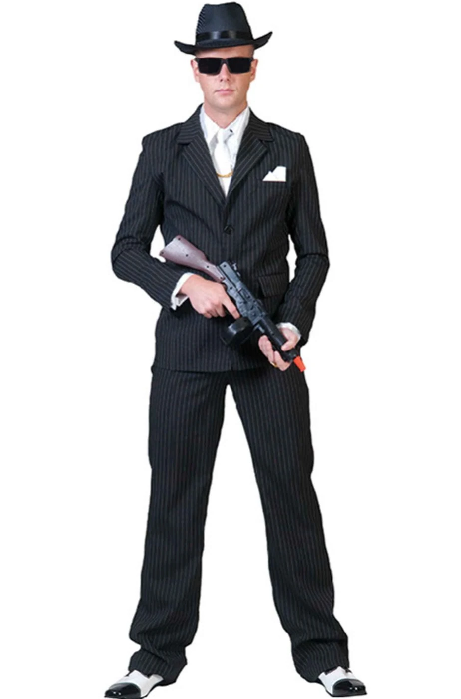Vestito di carnevale da gangster nero gessato con righine bianche