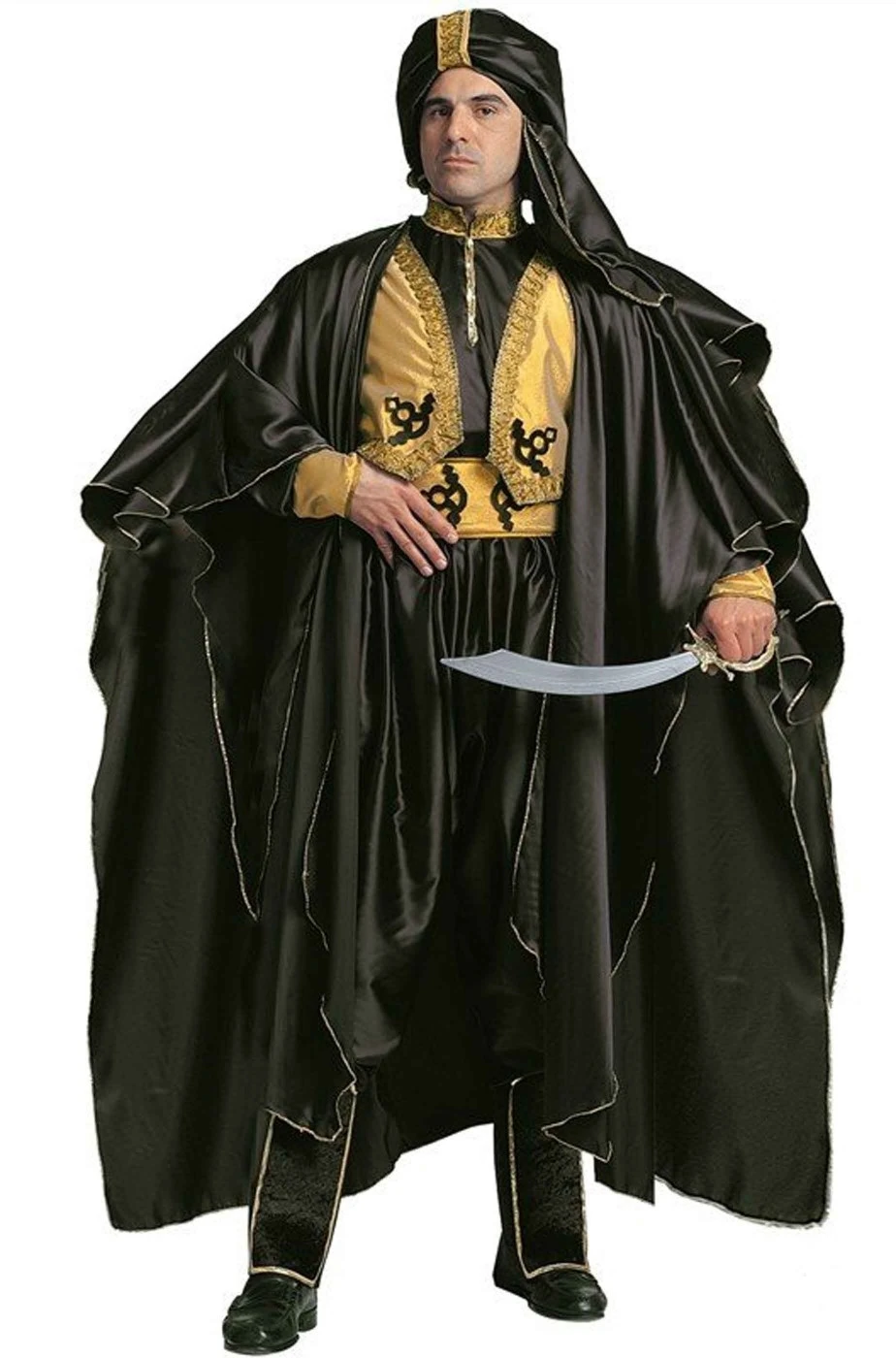Abito di carnevale da sultano che include l’abito con il gilet, l’ampio mantello nero, i pantaloni con il paratibie, il turbante piatto che, all’uso, si può appuntire verso l’alto con una imbottitura in carta.