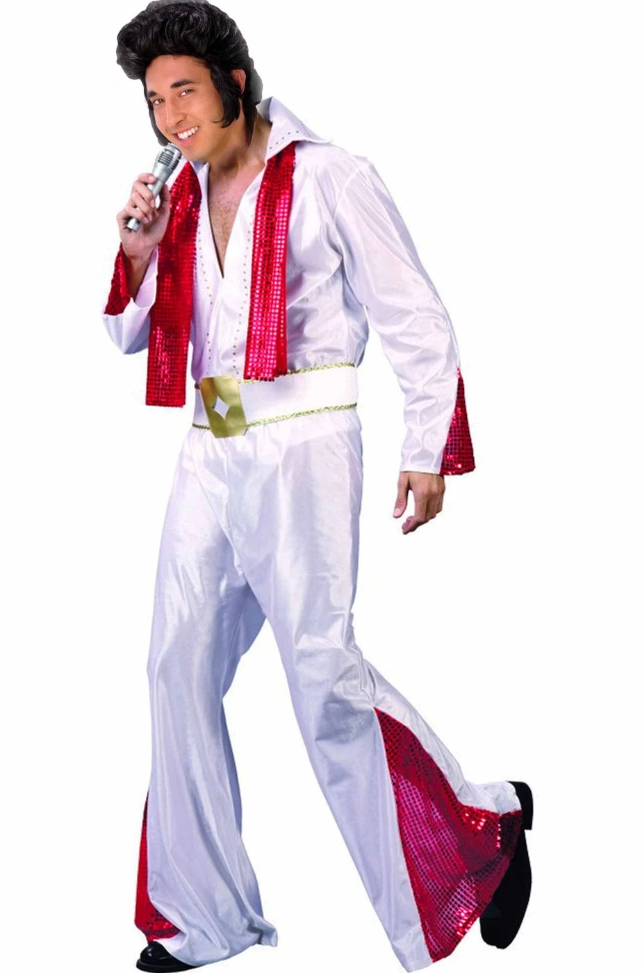 Costume uomo star del Rock Include tuta cintura e sciarpa. Il re del rock è sempre divertente. Per gruppi musicali, per spettacoli, per serate di karaoke. All’interno del sito trovi occhiali e parrucca. Basta una scarpa da ginnastica e oplà fatto tutto: potrai perfino sembrare Elvis Presley con questo vestito bianco a zampa