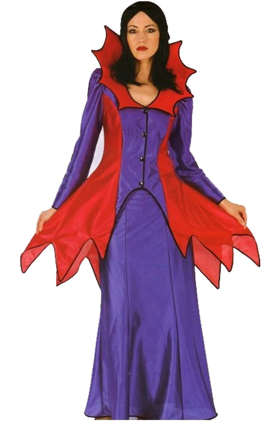 Costume di halloween da vampira donna rosso e viola lungo con gonna e giacca con grande collare. Una vampira fuori dagli schemi.