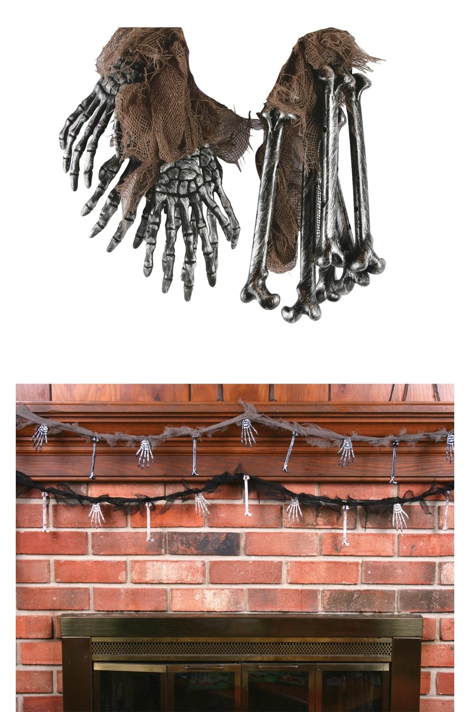 Decorazione Halloween con mani ed ossa tibie scheletro da appendere per interni. Ossa e mani sono legate da una striscia di sudario grigio. Una bellissima ghirlanda con mani ed ossa scheletro da disporre come uno striscione per realizzare un allestimento scheletrico alla tua festa di Haloween. Davvero un bell’addobbo per la camera dei bimbi nella notte delle streghe.