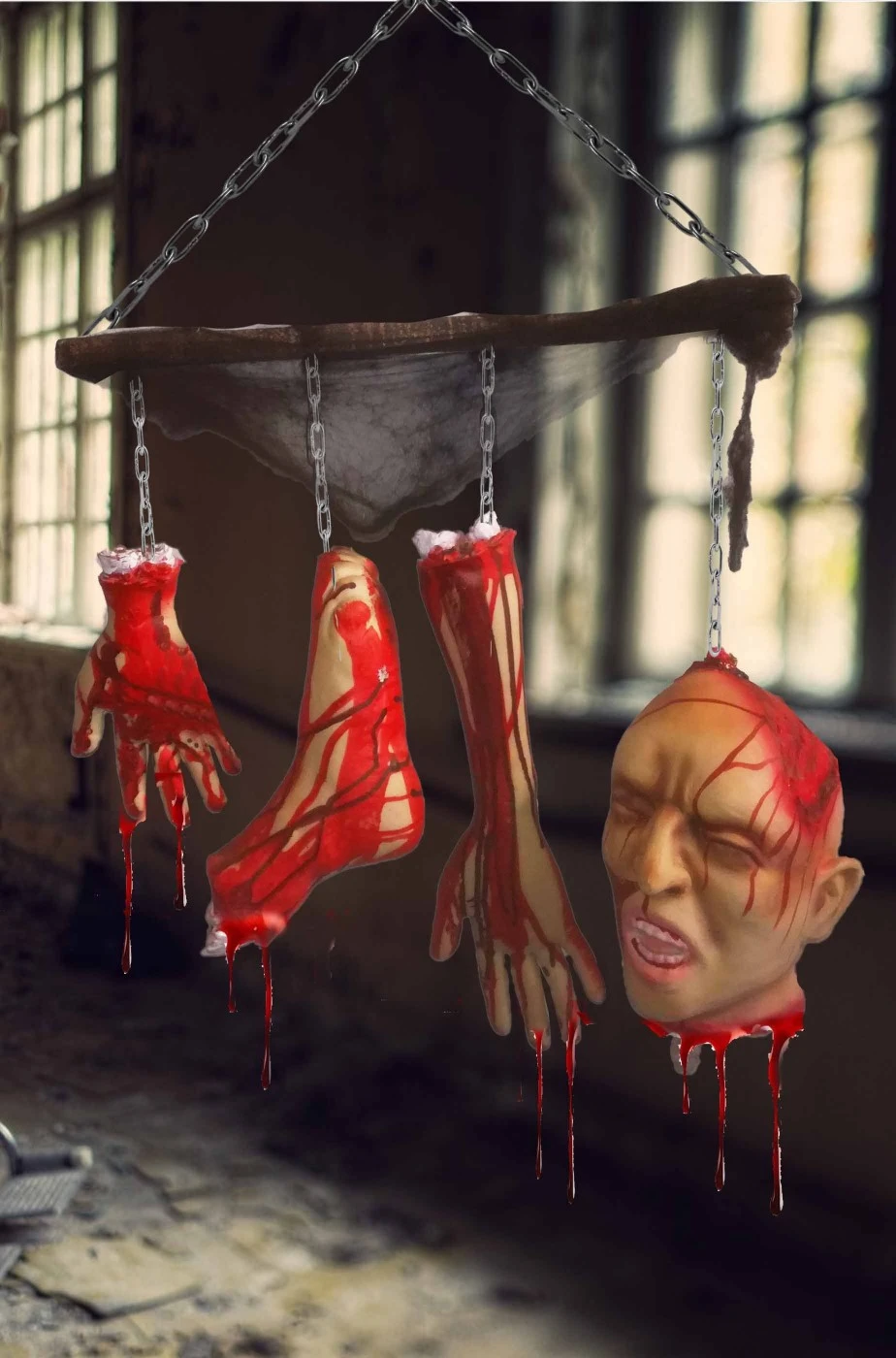 Composto da un’asta che sorregge quattro parti del corpo, testa, braccio, piede e mano sporchi di sangue, si appende dove vuoi. Completato da una inquietante ragnatela nera, realizzera’ un area spaventosa nel tuo locale.