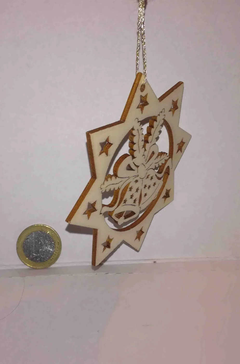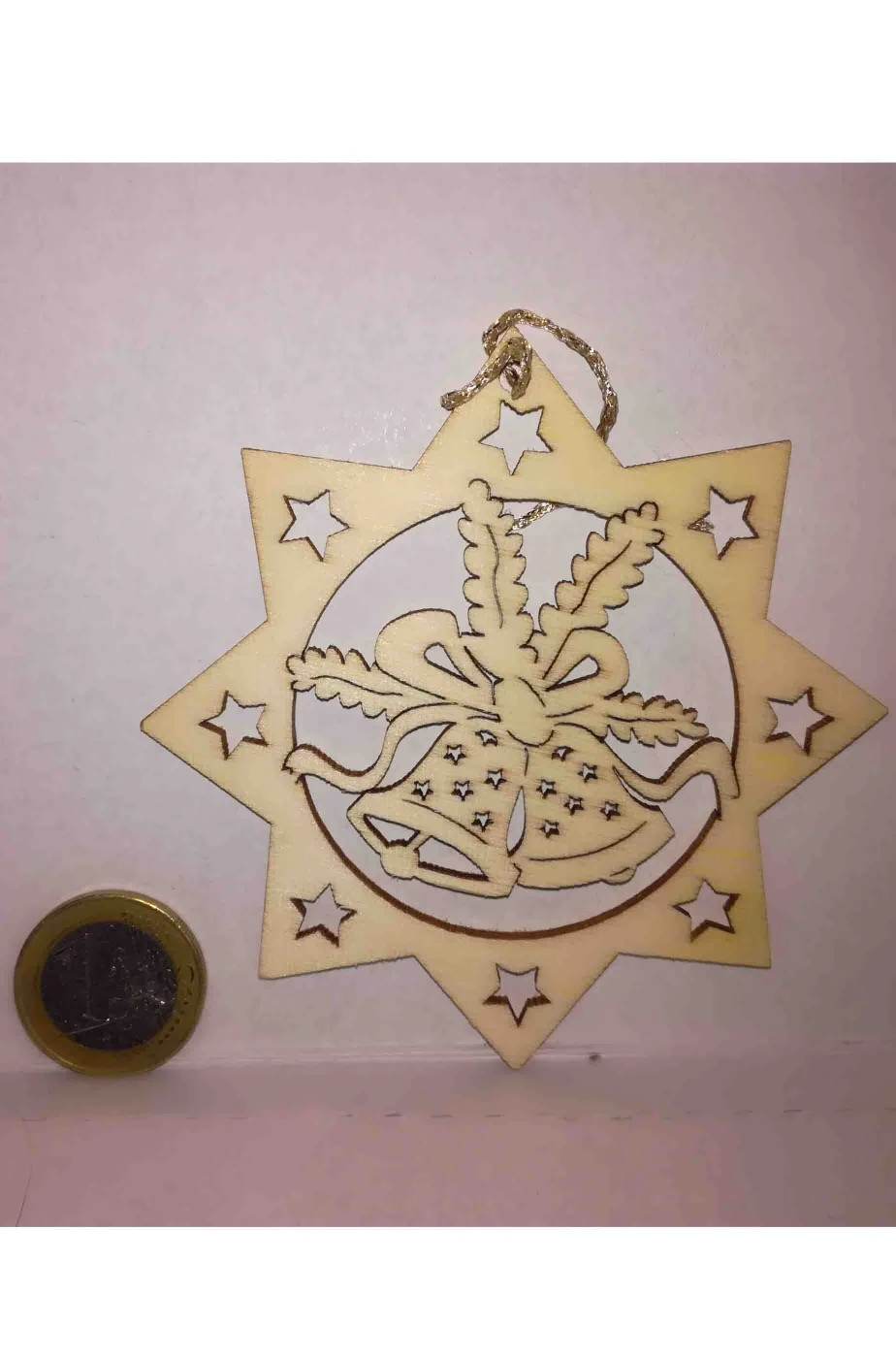 Stella cometa in legno intarsiata al laser da appendere all’albero di Natale oppure come addobbo di natale in casa o in ufficio o per fare una vetrina. Raffigura una coppia di campanelle di Natale.