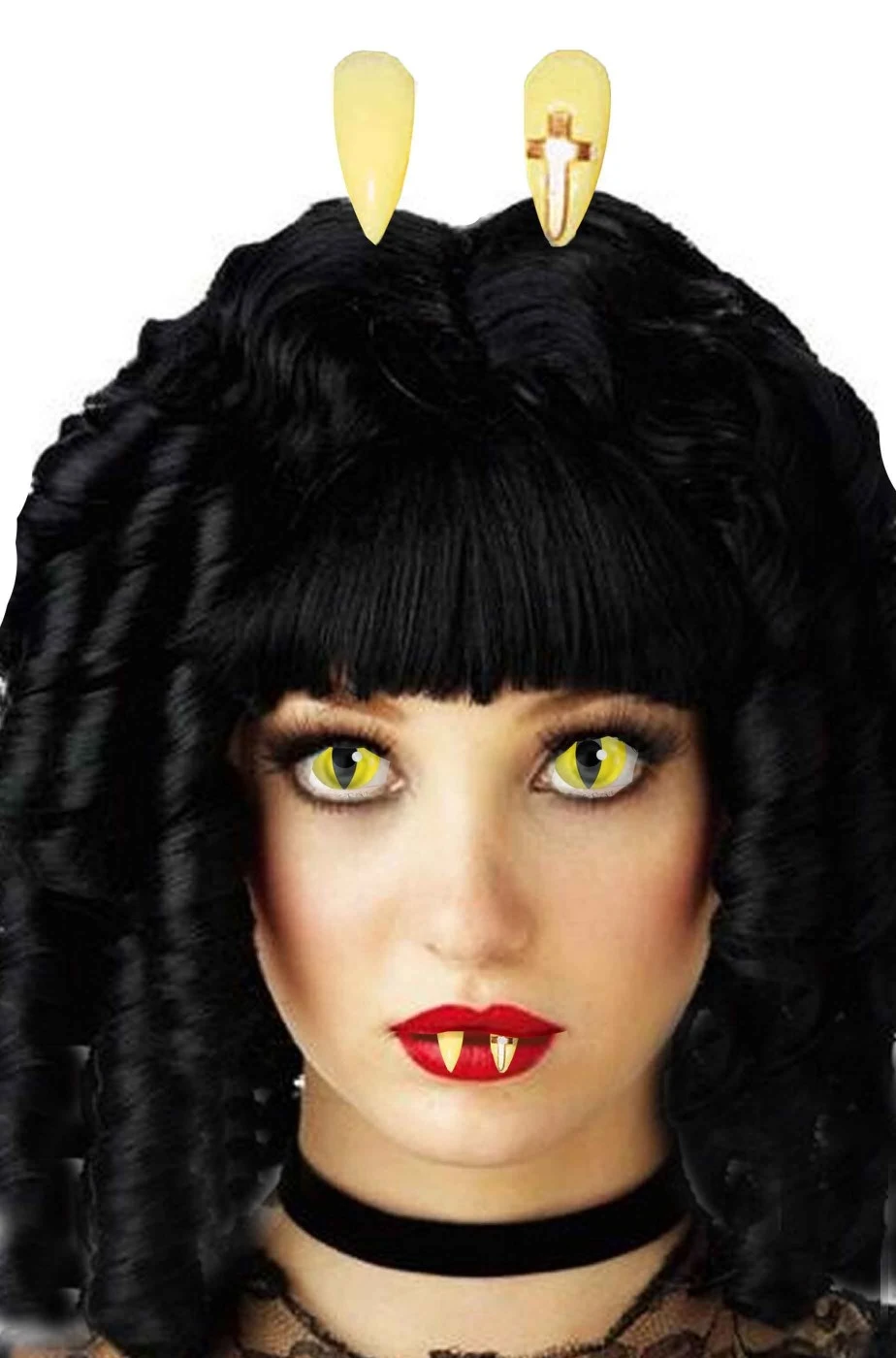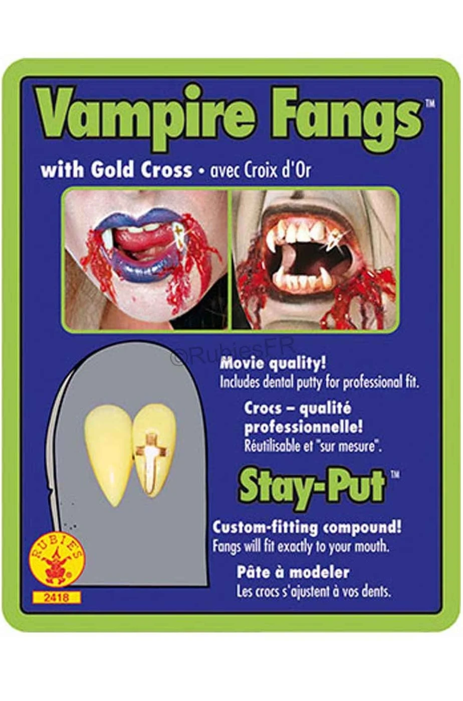 Coppia di denti finti canini da vampiro di colore bianco giallastro come una vera dentatura orribile da non morto. Uno dei due canini e’ decorato con una croce dorata. Ciascun dente finto contiene una capsula di resina termoplastica per creare un calco sul vostro dente. Vi bastera’ immergere la resina in acqua molto calda, non bollente, per farla sciogliere.