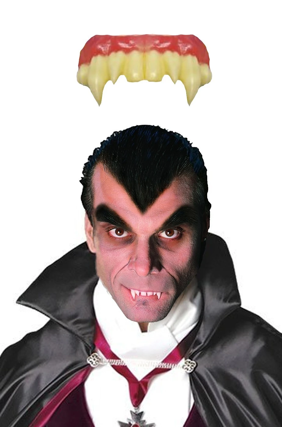 Dentiera rigida con denti canini vampiro lunghi per trucco Halloeen da vampiro, felino, lupo, lupo mannaro, gatto e qualsiasi animale con doppie zanne. Si applica con la pasta bicomponente inclusa ma ATTENZIONE LA RIUSCITA DIPENDE FORTEMENTE DALLA MESSA IN OPERA E DALLA CONFORMAZIONE DI PALATO E ARCO DENTALE. Leggere in fondo i dettagli