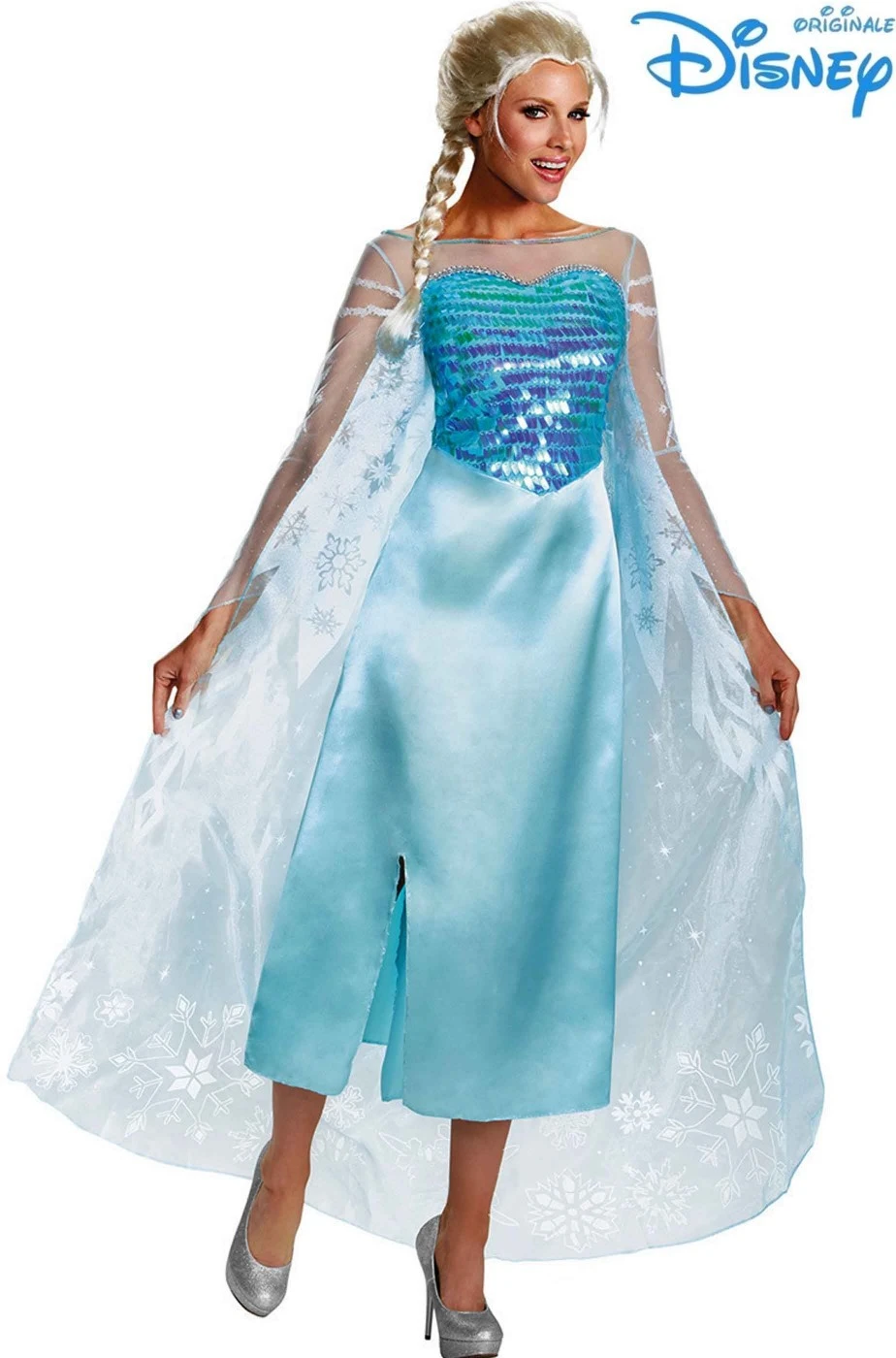 Questo è il costume di carnevale originale Disney di Elsa, dai cartoni animati Frozen della Disney la regina o principessa del regno del ghiaccio.